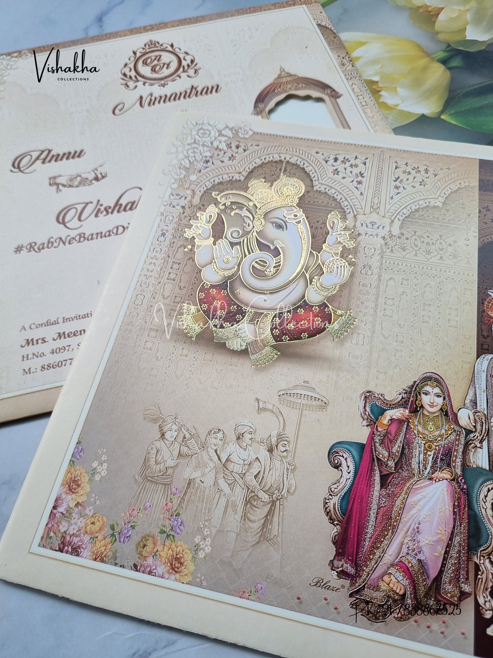 Barat Ganesh Ji Dulah Dulhan Hindu Light Brown Colored invitation Cards NA-1125-23