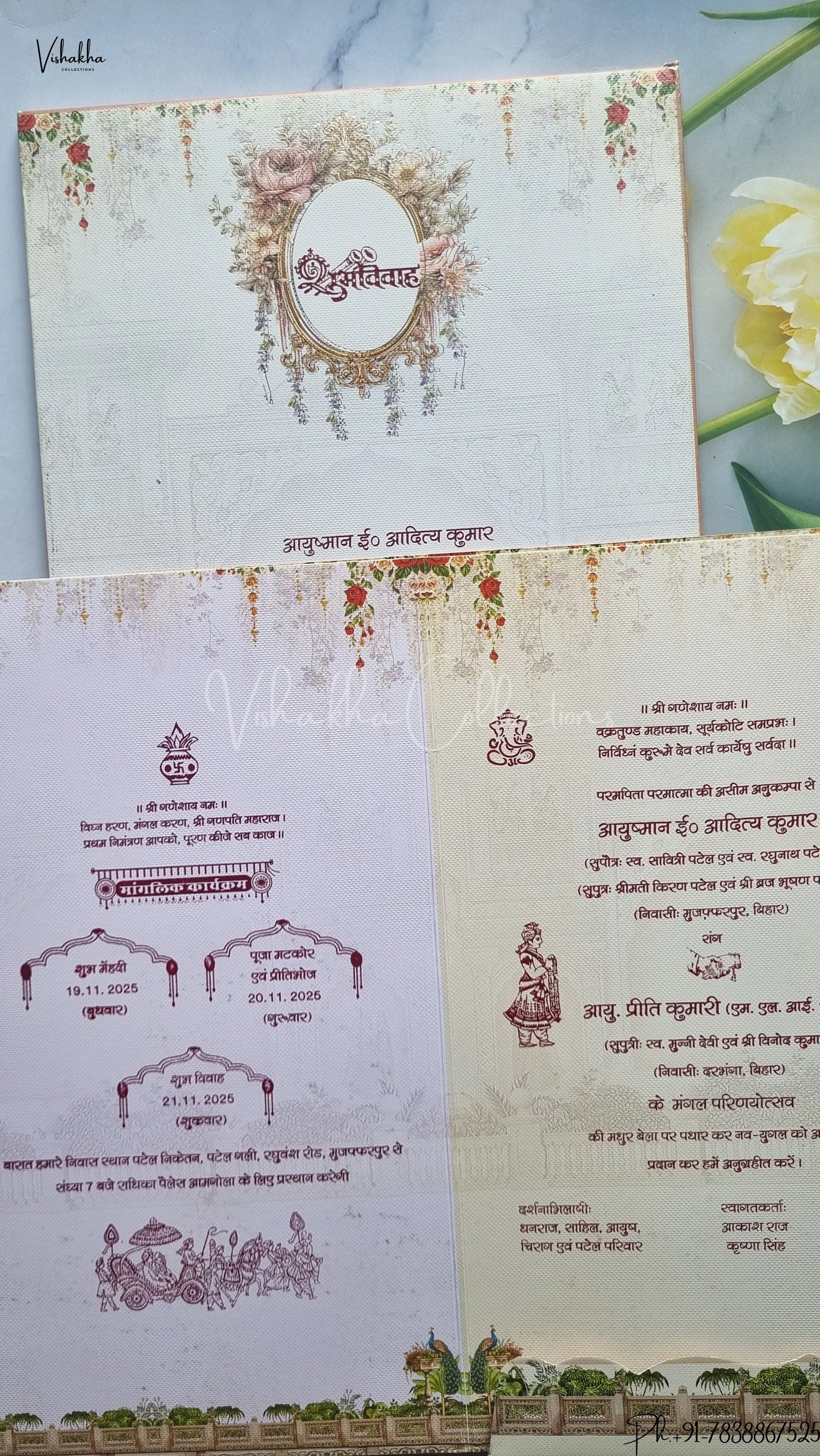 Vishakha Collections presents you beautiful luxury wedding invitation cards with all latest designs and the latest variety. Its just not a wedding invitation card but a beautiful feeling of love and relationship it carries for you. Beautifully printed and packed with a bundle of love. if you like it, dont think again, just go for it.If you are worrying about the quality of the product, send your doubts to us. We are here to help you. If you want in wholesale or bulk, dont forget to contact us.