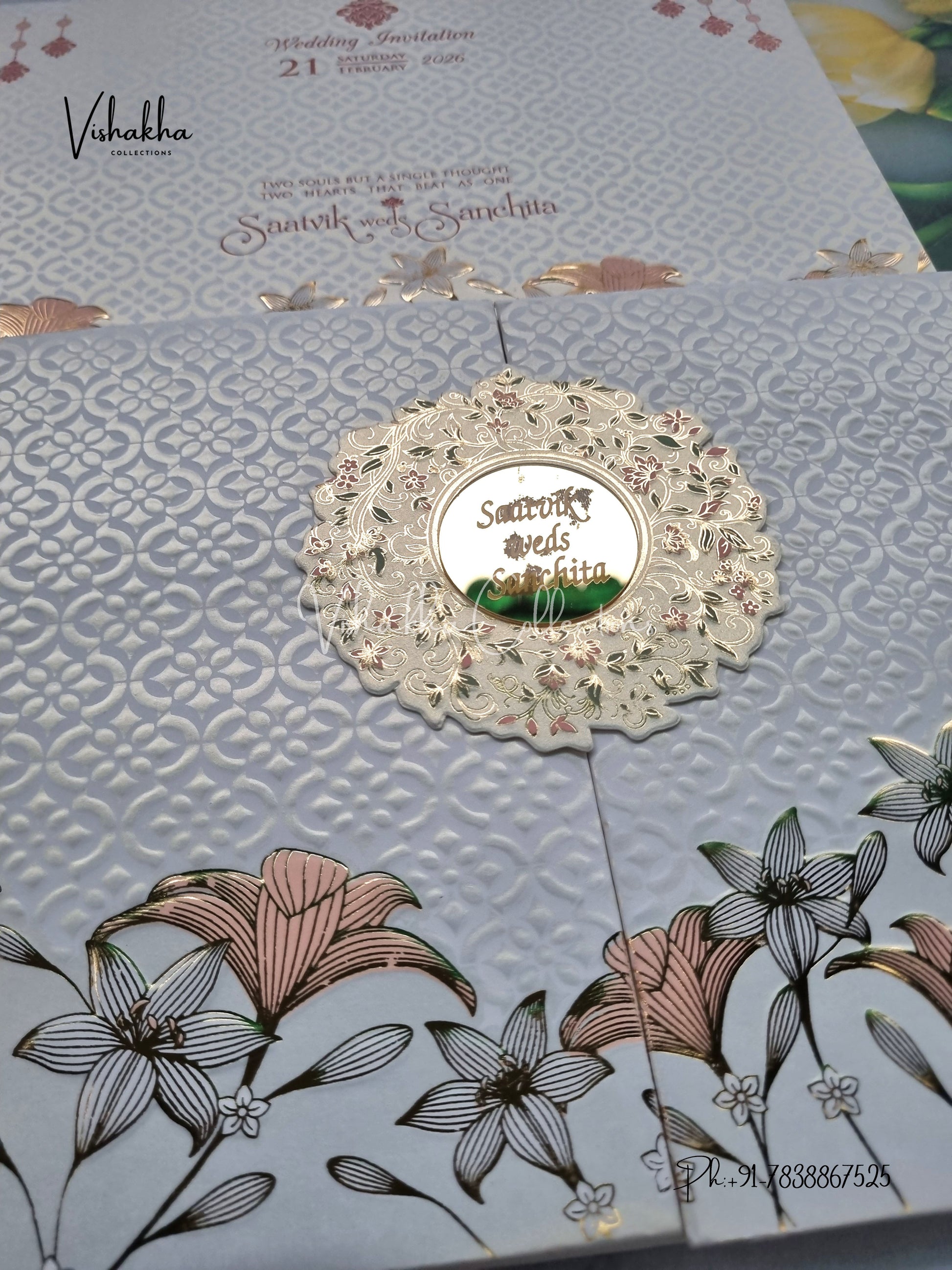 Vishakha Collections presents you beautiful luxury wedding invitation cards with all latest designs and the latest variety. Its just not a wedding invitation card but a beautiful feeling of love and relationship it carries for you. Beautifully printed and packed with a bundle of love. if you like it, dont think again, just go for it.If you are worrying about the quality of the product, send your doubts to us. We are here to help you. If you want in wholesale or bulk, dont forget to contact us.