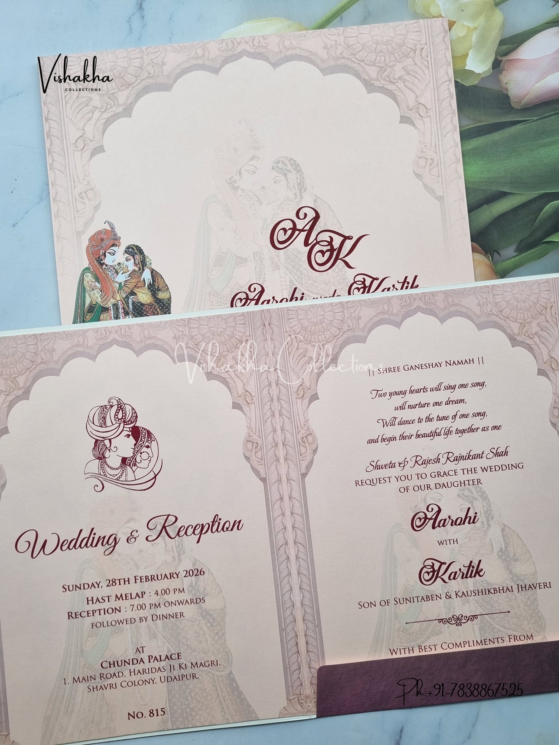 Vishakha Collections presents you beautiful luxury wedding invitation cards with all latest designs and the latest variety. Its just not a wedding invitation card but a beautiful feeling of love and relationship it carries for you. Beautifully printed and packed with a bundle of love. if you like it, dont think again, just go for it.If you are worrying about the quality of the product, send your doubts to us. We are here to help you. If you want in wholesale or bulk, dont forget to contact us.