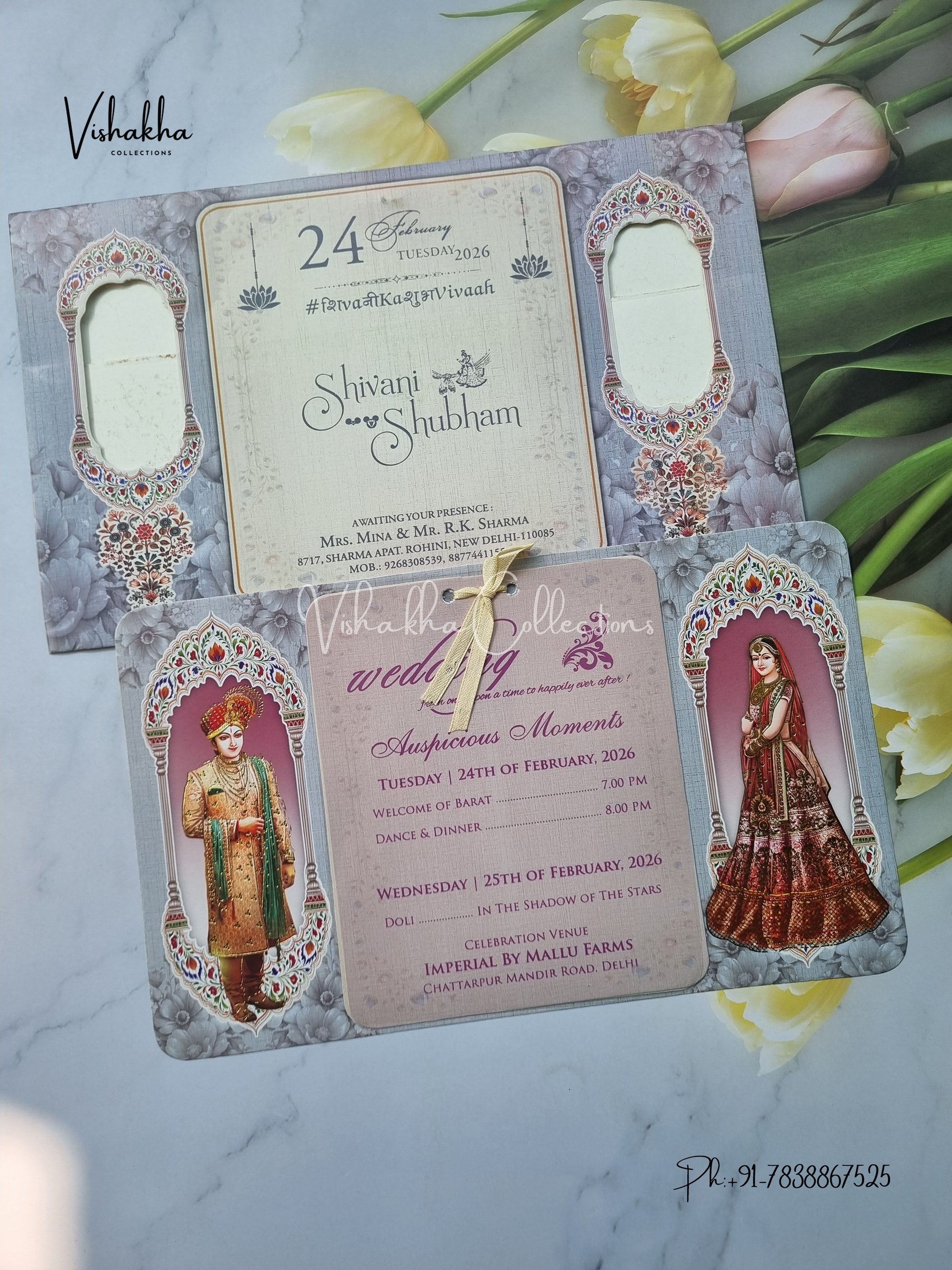 Vishakha Collections presents you beautiful luxury wedding invitation cards with all latest designs and the latest variety. Its just not a wedding invitation card but a beautiful feeling of love and relationship it carries for you. Beautifully printed and packed with a bundle of love. if you like it, dont think again, just go for it.If you are worrying about the quality of the product, send your doubts to us. We are here to help you. If you want in wholesale or bulk, dont forget to contact us.