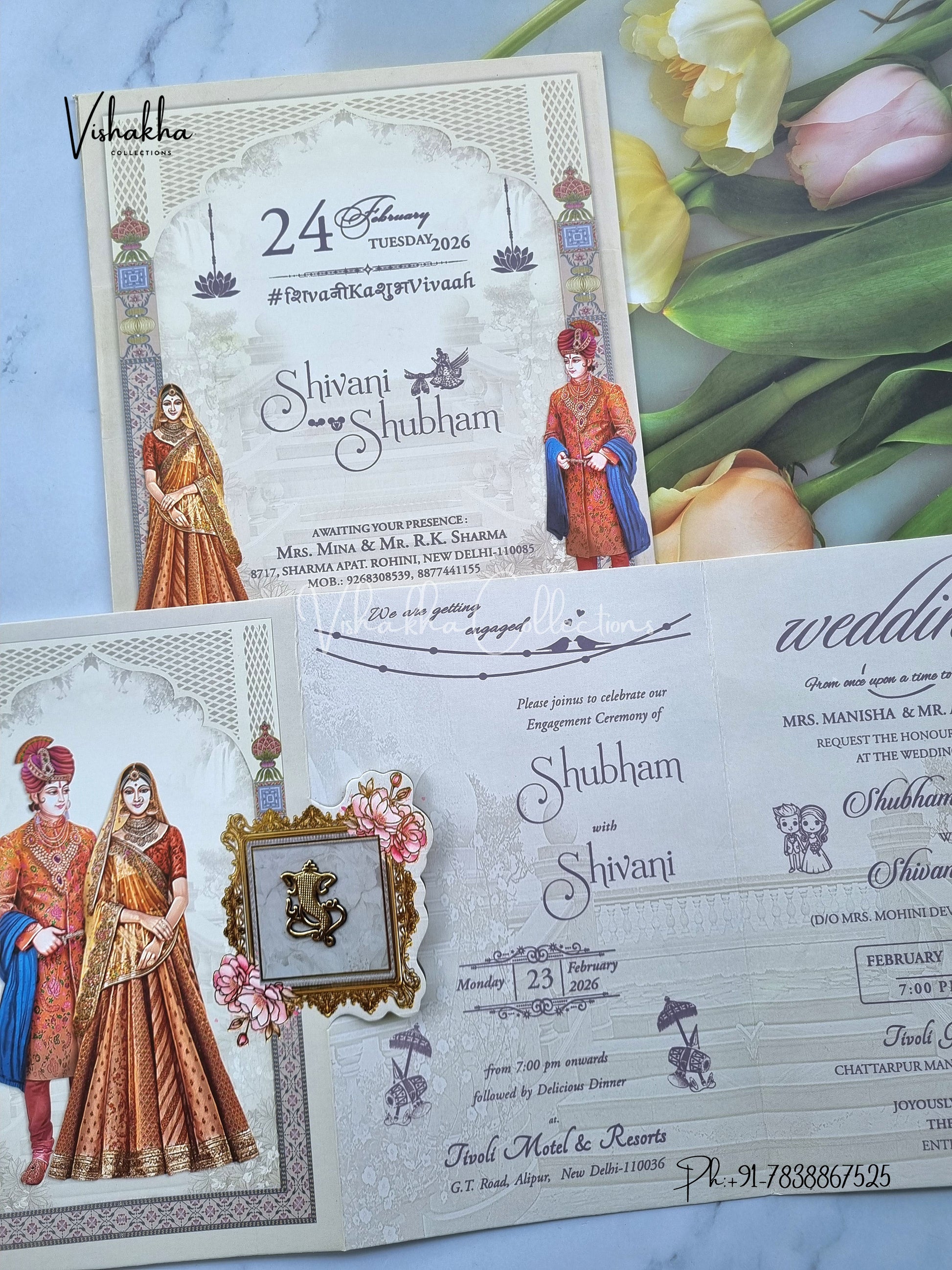 Vishakha Collections presents you beautiful luxury wedding invitation cards with all latest designs and the latest variety. Its just not a wedding invitation card but a beautiful feeling of love and relationship it carries for you. Beautifully printed and packed with a bundle of love. if you like it, dont think again, just go for it.If you are worrying about the quality of the product, send your doubts to us. We are here to help you. If you want in wholesale or bulk, dont forget to contact us.