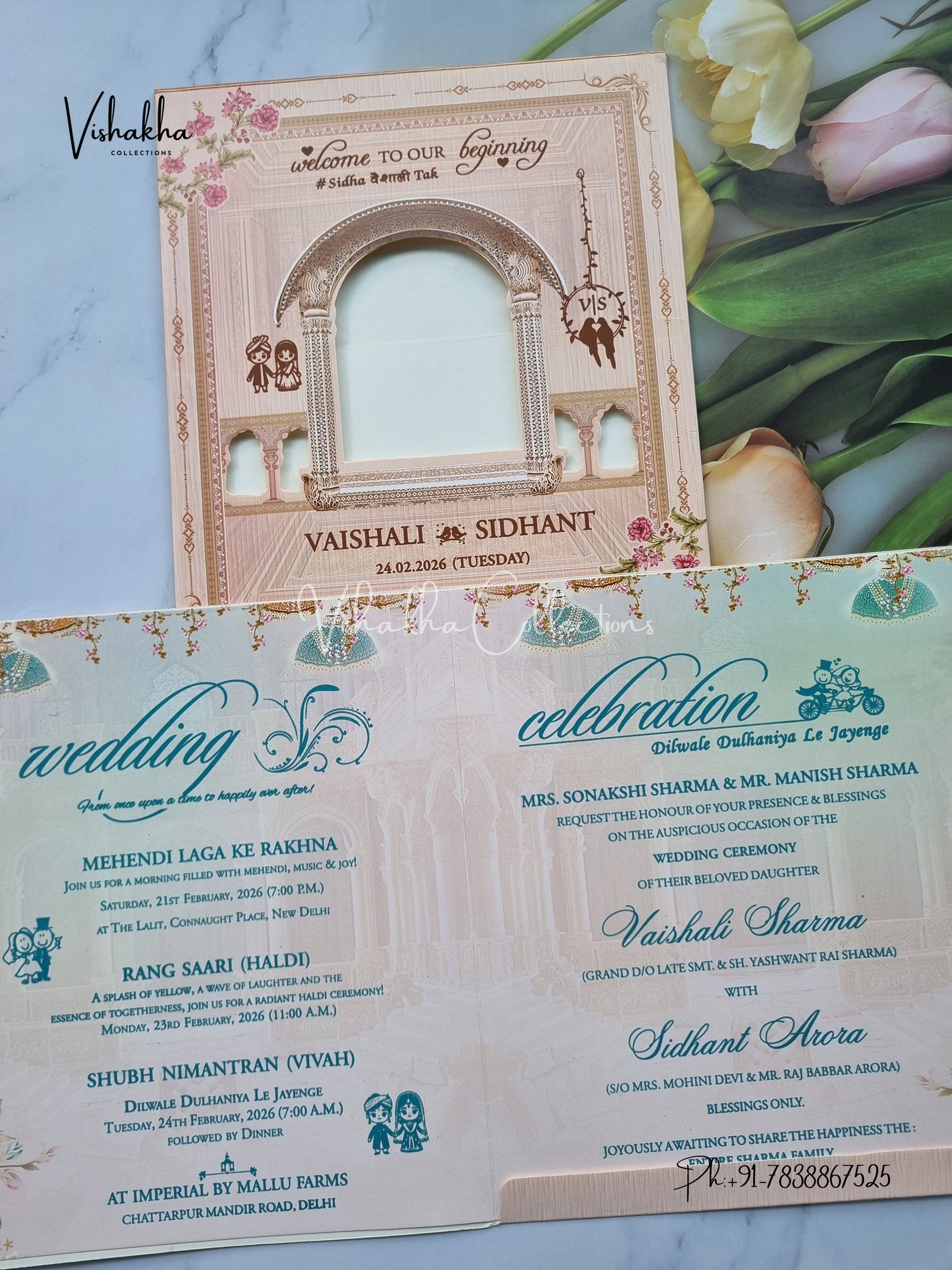 Vishakha Collections presents you beautiful luxury wedding invitation cards with all latest designs and the latest variety. Its just not a wedding invitation card but a beautiful feeling of love and relationship it carries for you. Beautifully printed and packed with a bundle of love. if you like it, dont think again, just go for it.If you are worrying about the quality of the product, send your doubts to us. We are here to help you. If you want in wholesale or bulk, dont forget to contact us.