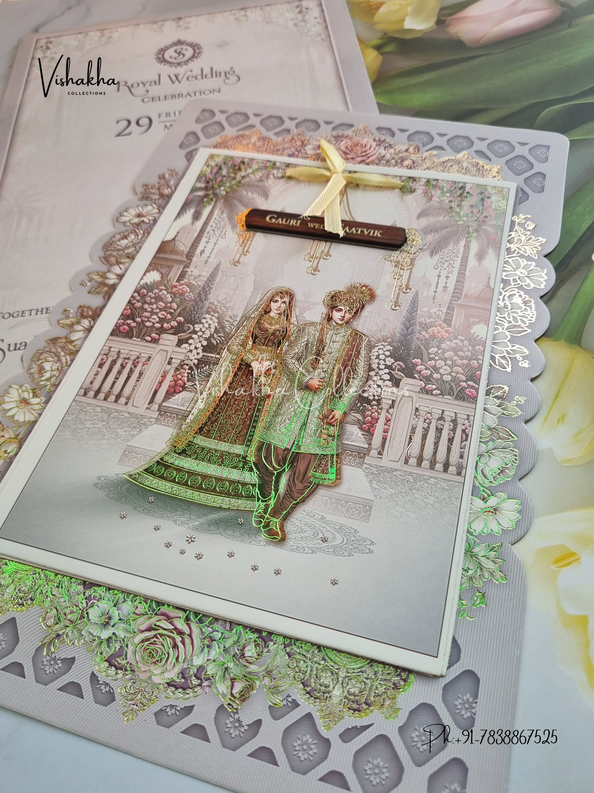Vishakha Collections presents you beautiful luxury wedding invitation cards with all latest designs and the latest variety. Its just not a wedding invitation card but a beautiful feeling of love and relationship it carries for you. Beautifully printed and packed with a bundle of love. if you like it, dont think again, just go for it.If you are worrying about the quality of the product, send your doubts to us. We are here to help you. If you want in wholesale or bulk, dont forget to contact us.