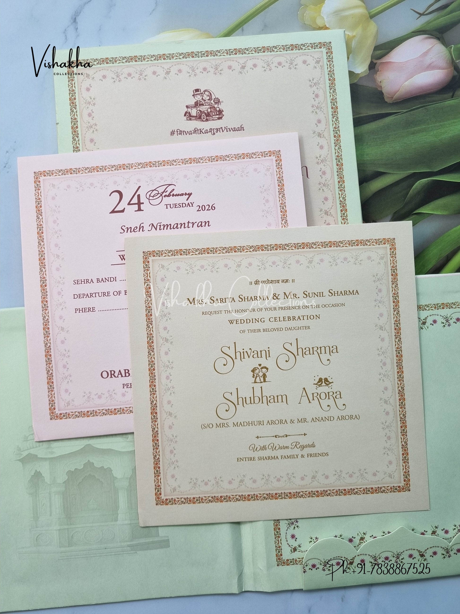Vishakha Collections presents you beautiful luxury wedding invitation cards with all latest designs and the latest variety. Its just not a wedding invitation card but a beautiful feeling of love and relationship it carries for you. Beautifully printed and packed with a bundle of love. if you like it, dont think again, just go for it.If you are worrying about the quality of the product, send your doubts to us. We are here to help you. If you want in wholesale or bulk, dont forget to contact us.