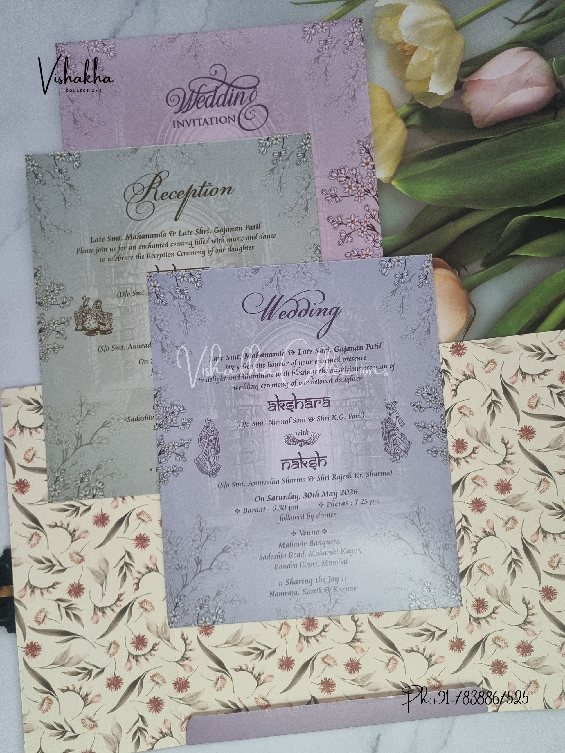 Vishakha Collections presents you beautiful luxury wedding invitation cards with all latest designs and the latest variety. Its just not a wedding invitation card but a beautiful feeling of love and relationship it carries for you. Beautifully printed and packed with a bundle of love. if you like it, dont think again, just go for it.If you are worrying about the quality of the product, send your doubts to us. We are here to help you. If you want in wholesale or bulk, dont forget to contact us.