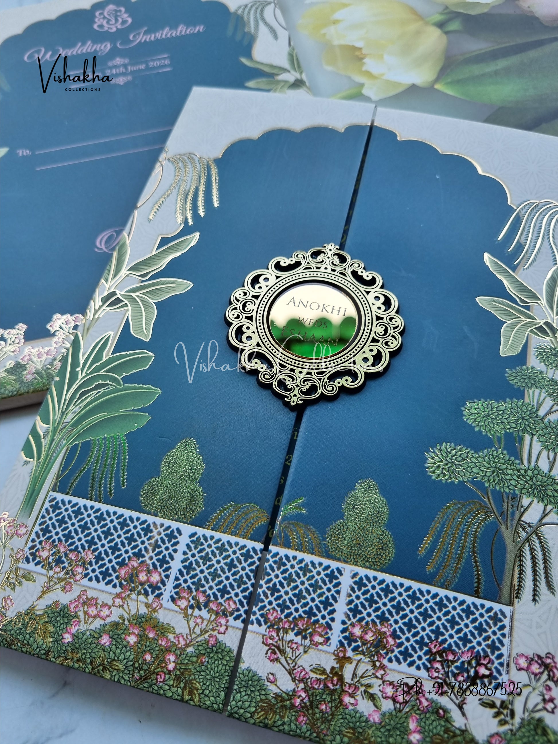 Vishakha Collections presents you beautiful luxury wedding invitation cards with all latest designs and the latest variety. Its just not a wedding invitation card but a beautiful feeling of love and relationship it carries for you. Beautifully printed and packed with a bundle of love. if you like it, dont think again, just go for it.If you are worrying about the quality of the product, send your doubts to us. We are here to help you. If you want in wholesale or bulk, dont forget to contact us.