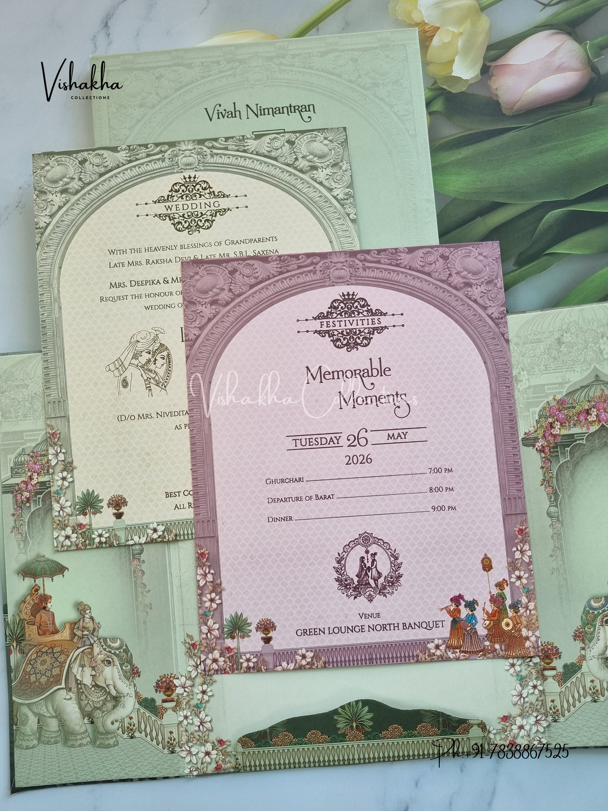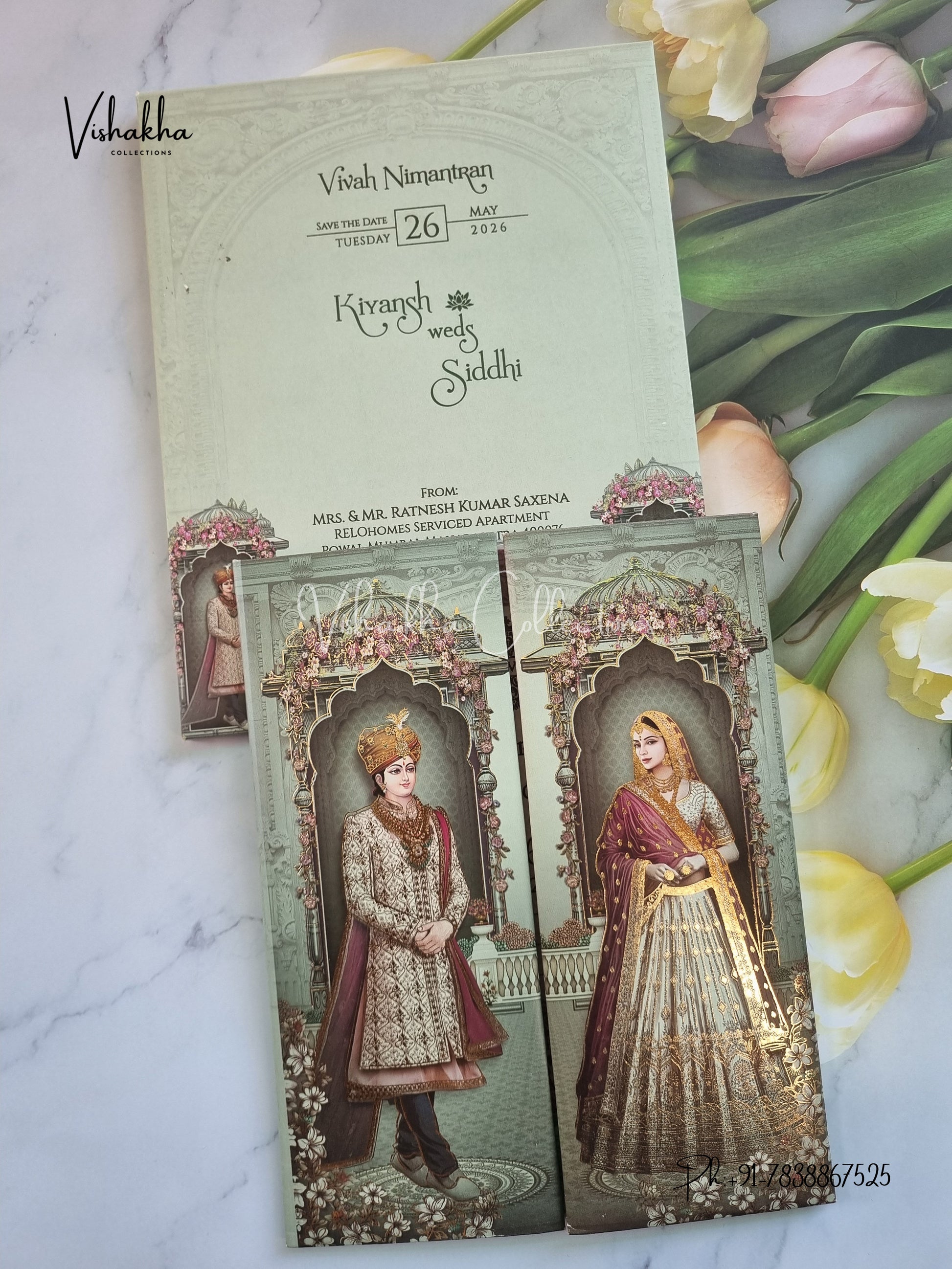 Vishakha Collections presents you beautiful luxury wedding invitation cards with all latest designs and the latest variety. Its just not a wedding invitation card but a beautiful feeling of love and relationship it carries for you. Beautifully printed and packed with a bundle of love. if you like it, dont think again, just go for it.If you are worrying about the quality of the product, send your doubts to us. We are here to help you. If you want in wholesale or bulk, dont forget to contact us.
