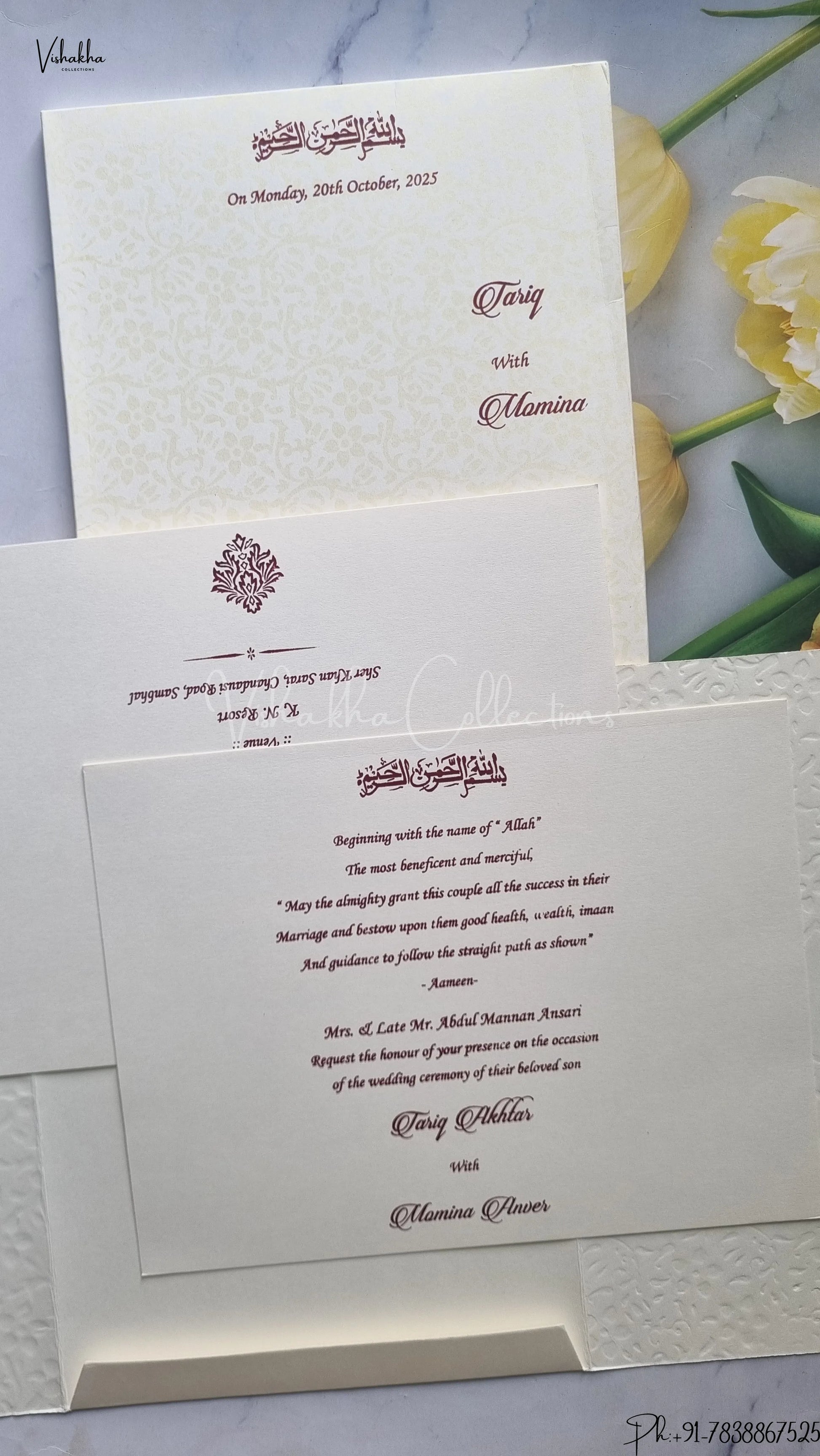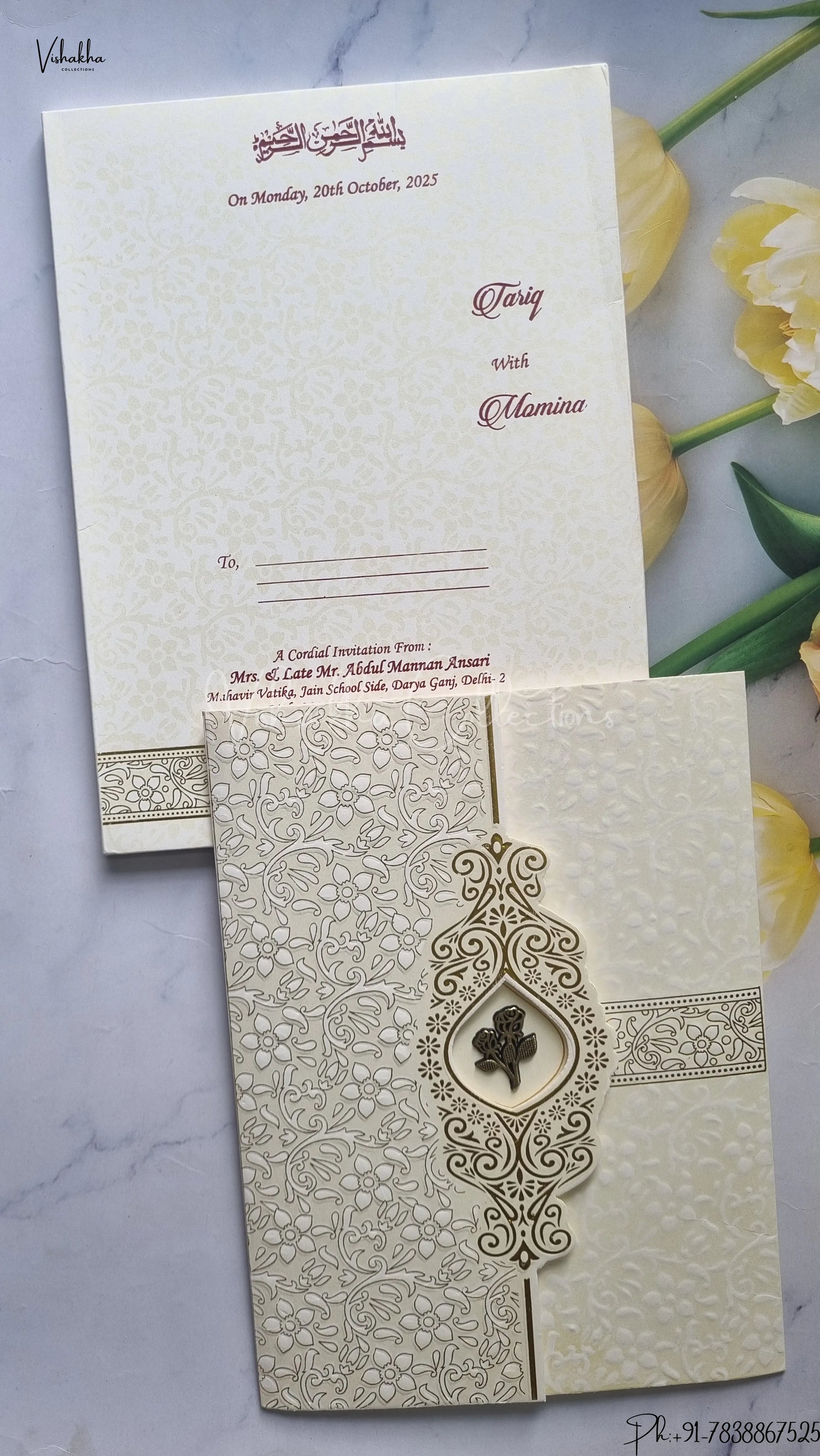 Vishakha Collections presents you beautiful luxury wedding invitation cards with all latest designs and the latest variety. Its just not a wedding invitation card but a beautiful feeling of love and relationship it carries for you. Beautifully printed and packed with a bundle of love. if you like it, dont think again, just go for it.If you are worrying about the quality of the product, send your doubts to us. We are here to help you. If you want in wholesale or bulk, dont forget to contact us.