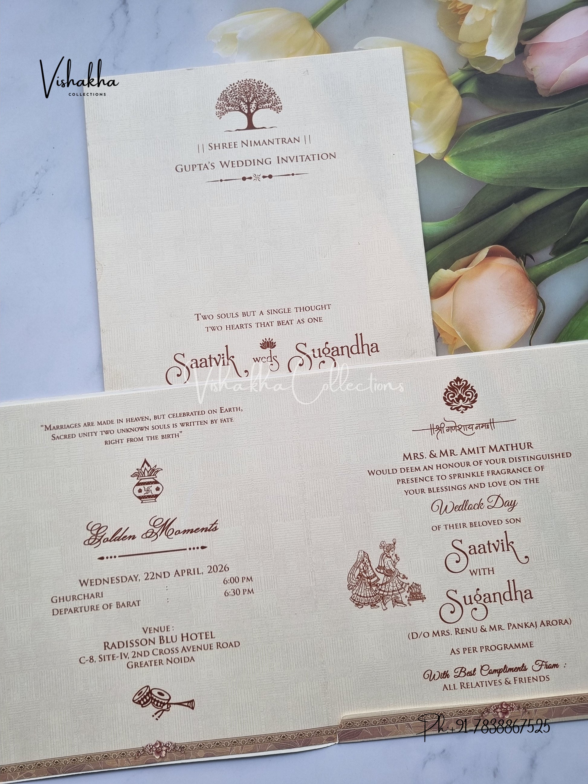 Vishakha Collections presents you beautiful luxury wedding invitation cards with all latest designs and the latest variety. Its just not a wedding invitation card but a beautiful feeling of love and relationship it carries for you. Beautifully printed and packed with a bundle of love. if you like it, dont think again, just go for it.If you are worrying about the quality of the product, send your doubts to us. We are here to help you. If you want in wholesale or bulk, dont forget to contact us.