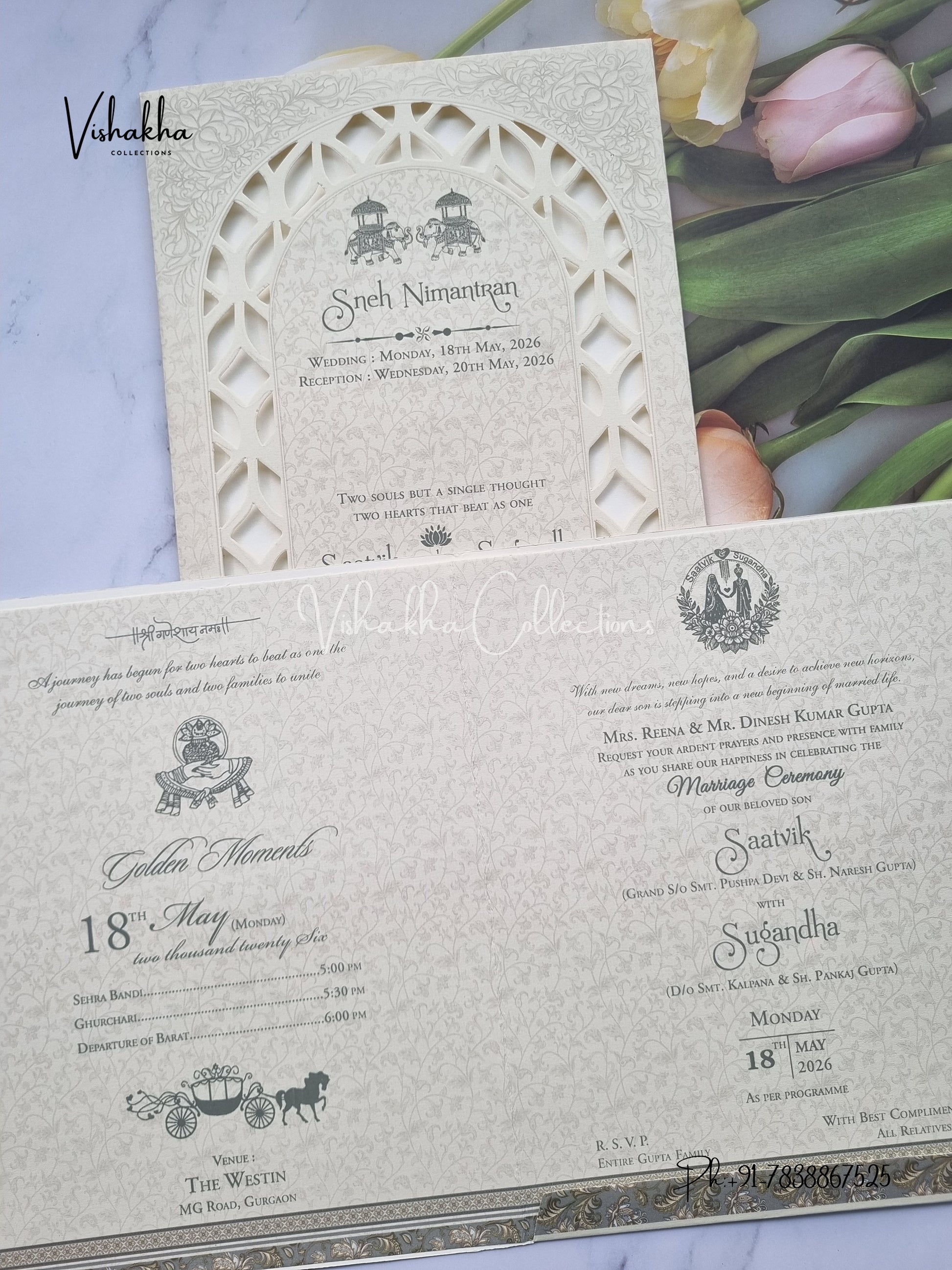Vishakha Collections presents you beautiful luxury wedding invitation cards with all latest designs and the latest variety. Its just not a wedding invitation card but a beautiful feeling of love and relationship it carries for you. Beautifully printed and packed with a bundle of love. if you like it, dont think again, just go for it.If you are worrying about the quality of the product, send your doubts to us. We are here to help you. If you want in wholesale or bulk, dont forget to contact us.