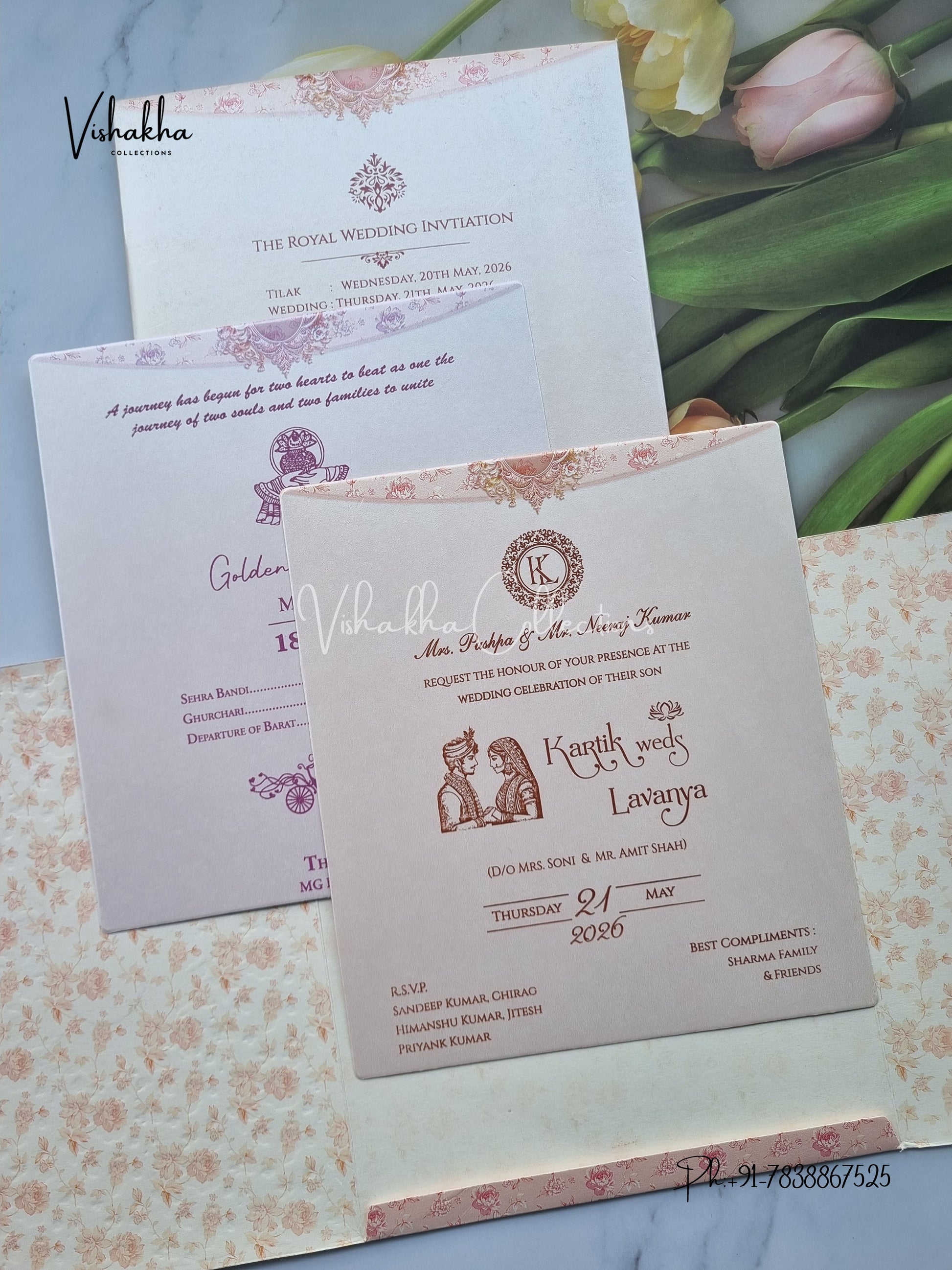Vishakha Collections presents you beautiful luxury wedding invitation cards with all latest designs and the latest variety. Its just not a wedding invitation card but a beautiful feeling of love and relationship it carries for you. Beautifully printed and packed with a bundle of love. if you like it, dont think again, just go for it.If you are worrying about the quality of the product, send your doubts to us. We are here to help you. If you want in wholesale or bulk, dont forget to contact us.