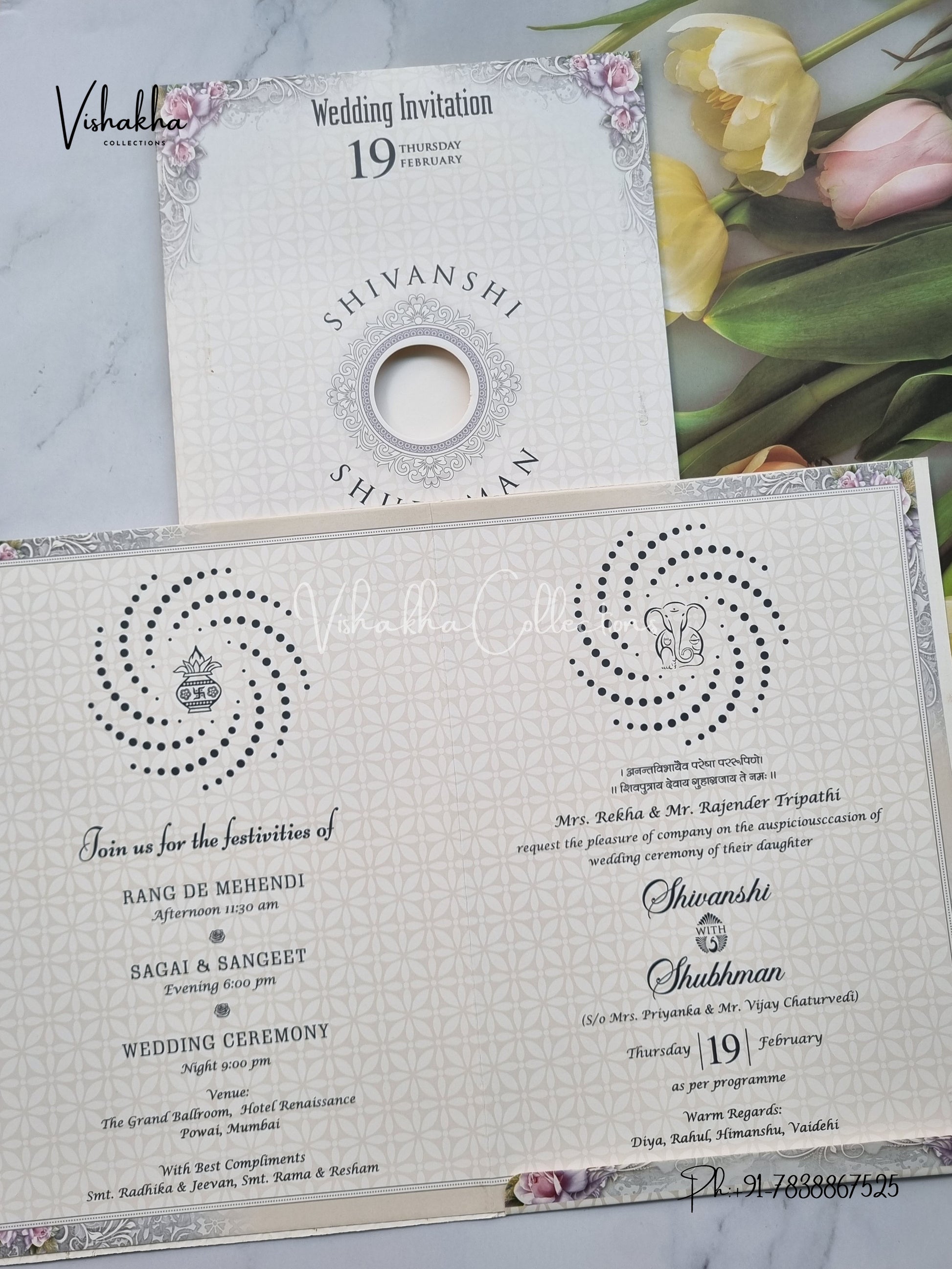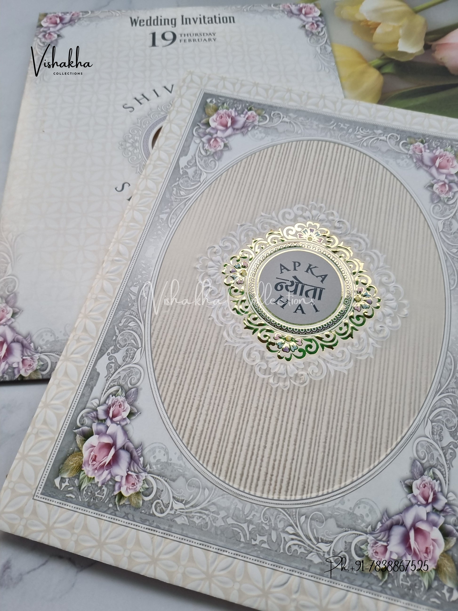 Vishakha Collections presents you beautiful luxury wedding invitation cards with all latest designs and the latest variety. Its just not a wedding invitation card but a beautiful feeling of love and relationship it carries for you. Beautifully printed and packed with a bundle of love. if you like it, dont think again, just go for it.If you are worrying about the quality of the product, send your doubts to us. We are here to help you. If you want in wholesale or bulk, dont forget to contact us.