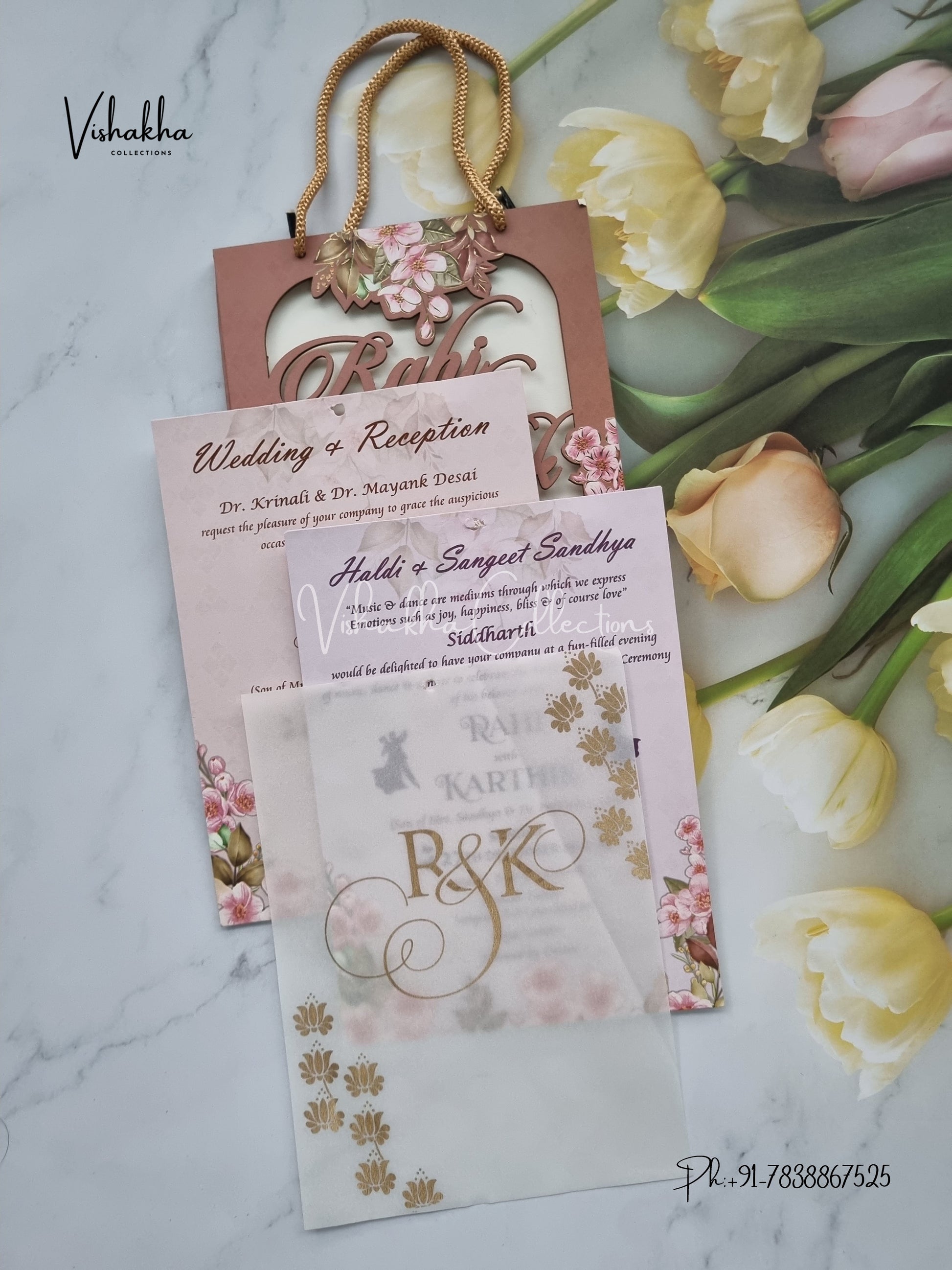 Flower Hindu Muslim Christian Sikh MDF Board Laser Cut Named MDF Laser Cut Carry Bag invitation Cards VN-636