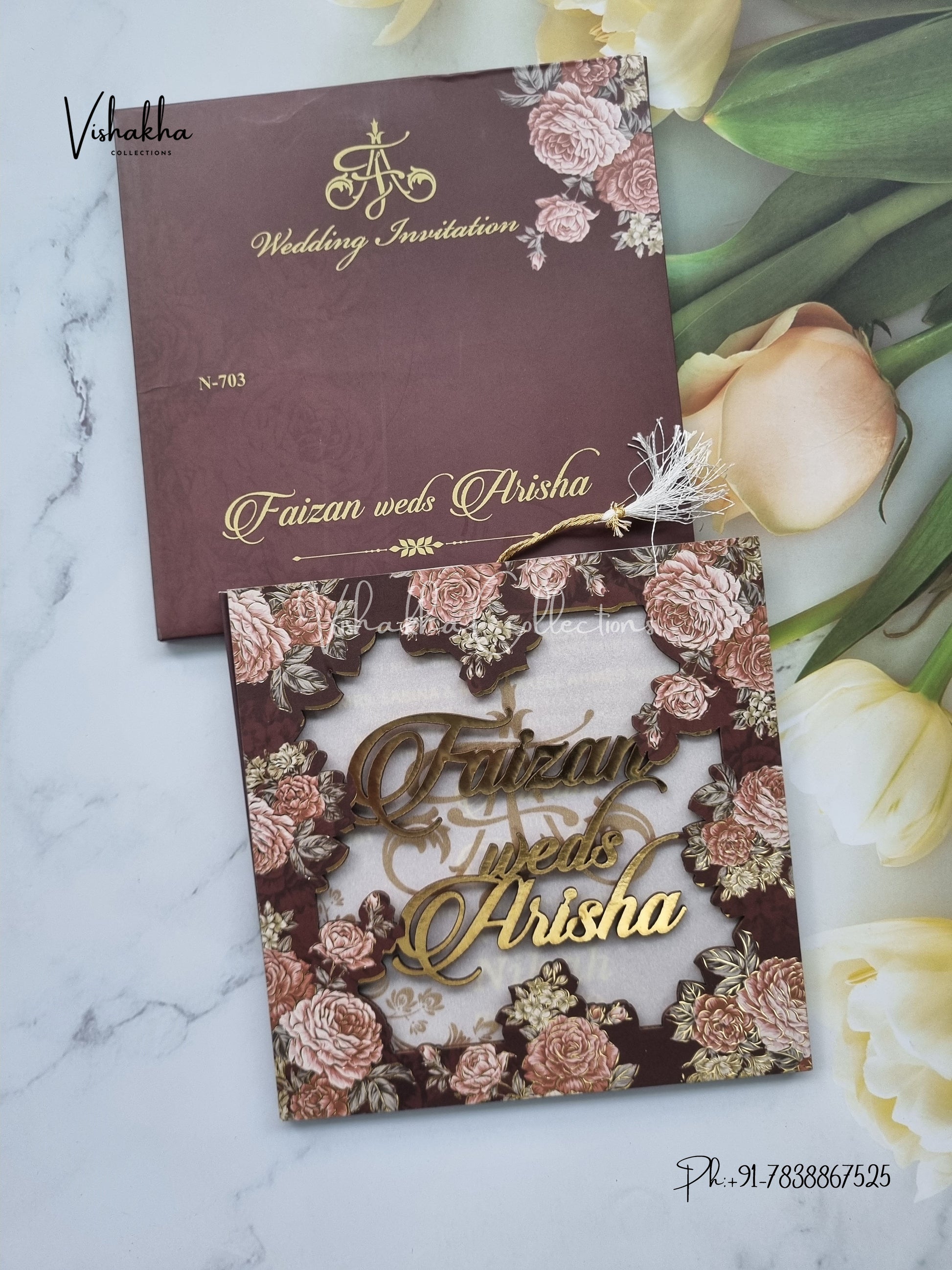 Vishakha Collections presents you beautiful luxury wedding invitation cards with all latest designs and the latest variety. Its just not a wedding invitation card but a beautiful feeling of love and relationship it carries for you. Beautifully printed and packed with a bundle of love. if you like it, dont think again, just go for it.If you are worrying about the quality of the product, send your doubts to us. We are here to help you. If you want in wholesale or bulk, dont forget to contact us.