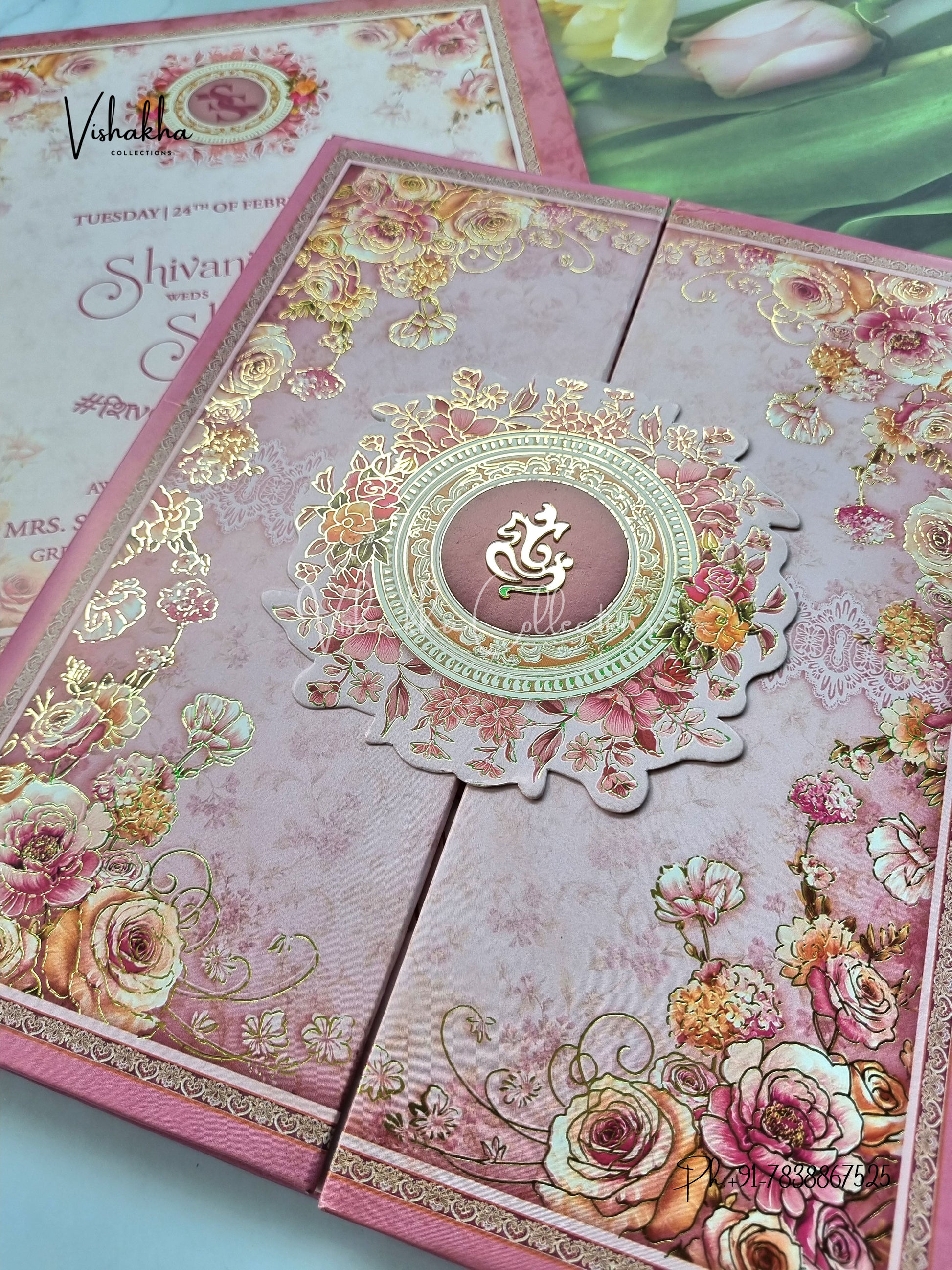 Vishakha Collections presents you beautiful luxury wedding invitation cards with all latest designs and the latest variety. Its just not a wedding invitation card but a beautiful feeling of love and relationship it carries for you. Beautifully printed and packed with a bundle of love. if you like it, dont think again, just go for it.If you are worrying about the quality of the product, send your doubts to us. We are here to help you. If you want in wholesale or bulk, dont forget to contact us.