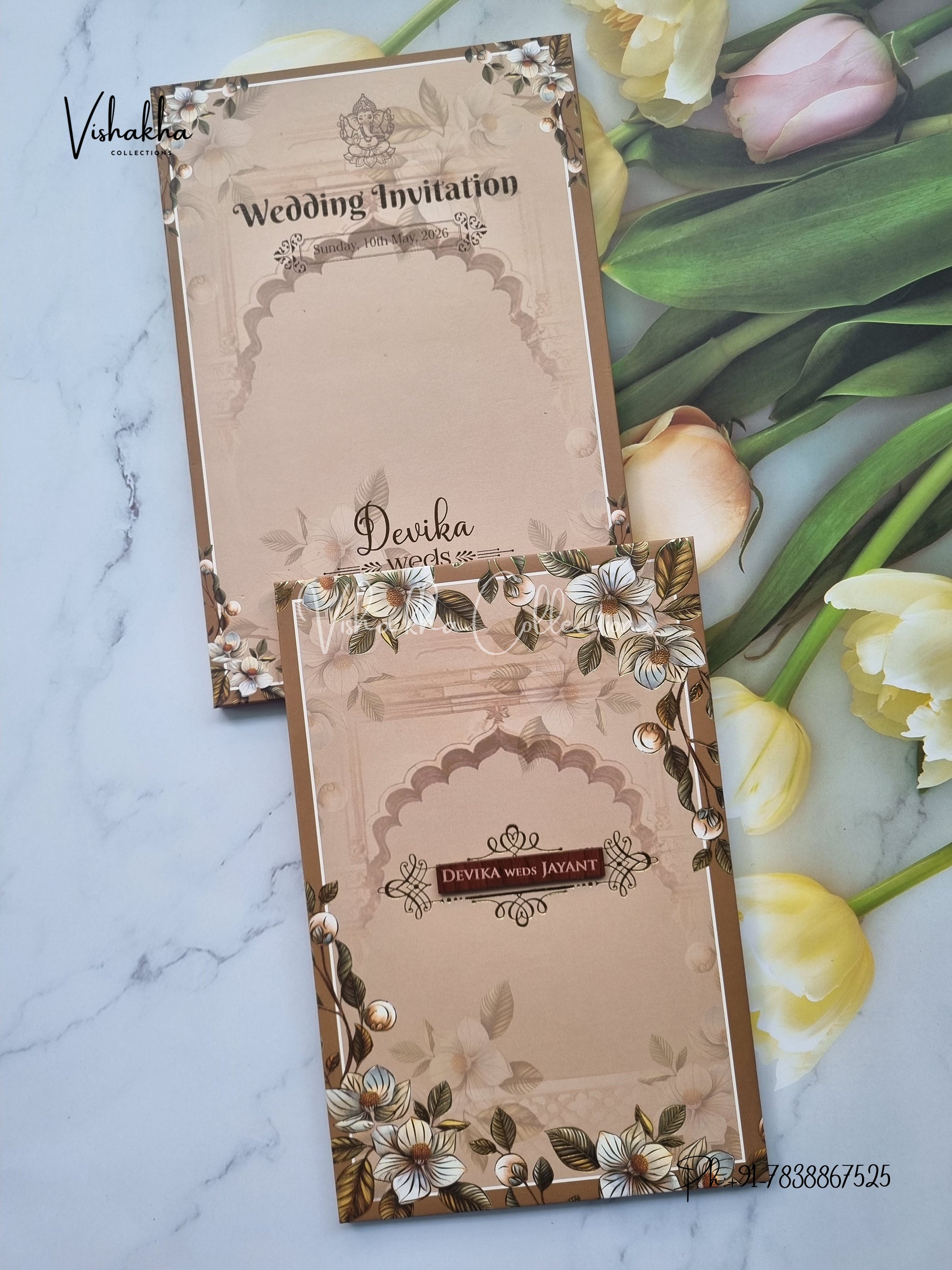 Vishakha Collections presents you beautiful luxury wedding invitation cards with all latest designs and the latest variety. Its just not a wedding invitation card but a beautiful feeling of love and relationship it carries for you. Beautifully printed and packed with a bundle of love. if you like it, dont think again, just go for it.If you are worrying about the quality of the product, send your doubts to us. We are here to help you. If you want in wholesale or bulk, dont forget to contact us.