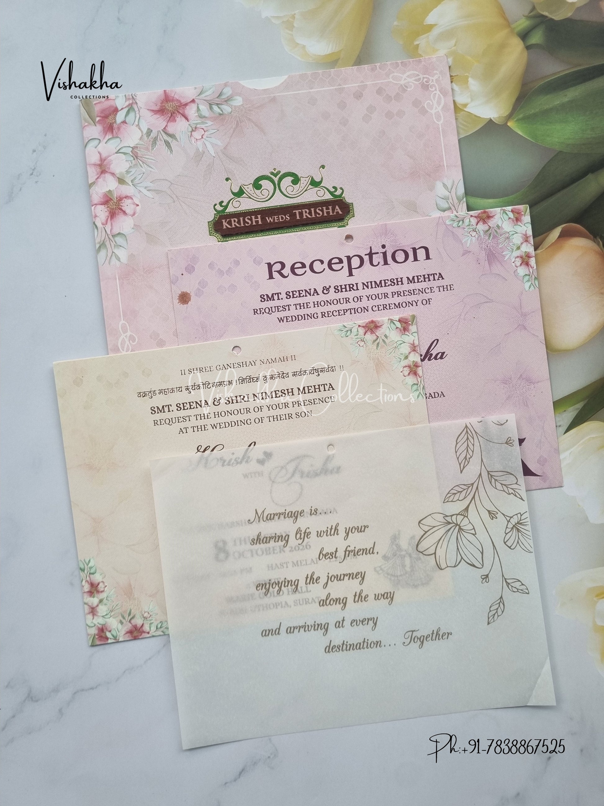 Vishakha Collections presents you beautiful luxury wedding invitation cards with all latest designs and the latest variety. Its just not a wedding invitation card but a beautiful feeling of love and relationship it carries for you. Beautifully printed and packed with a bundle of love. if you like it, dont think again, just go for it.If you are worrying about the quality of the product, send your doubts to us. We are here to help you. If you want in wholesale or bulk, dont forget to contact us.