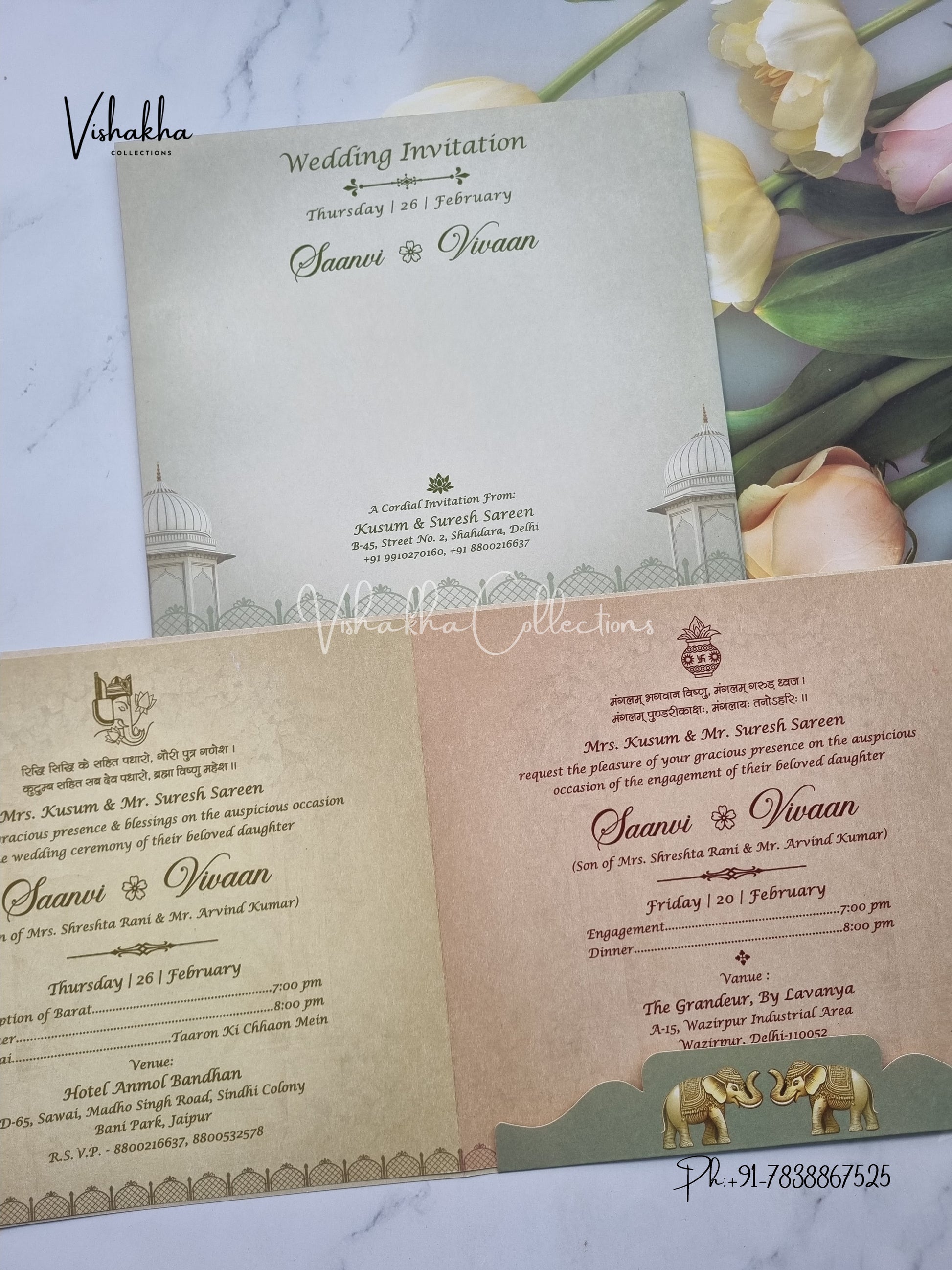 Vishakha Collections presents you beautiful luxury wedding invitation cards with all latest designs and the latest variety. Its just not a wedding invitation card but a beautiful feeling of love and relationship it carries for you. Beautifully printed and packed with a bundle of love. if you like it, dont think again, just go for it.If you are worrying about the quality of the product, send your doubts to us. We are here to help you. If you want in wholesale or bulk, dont forget to contact us.