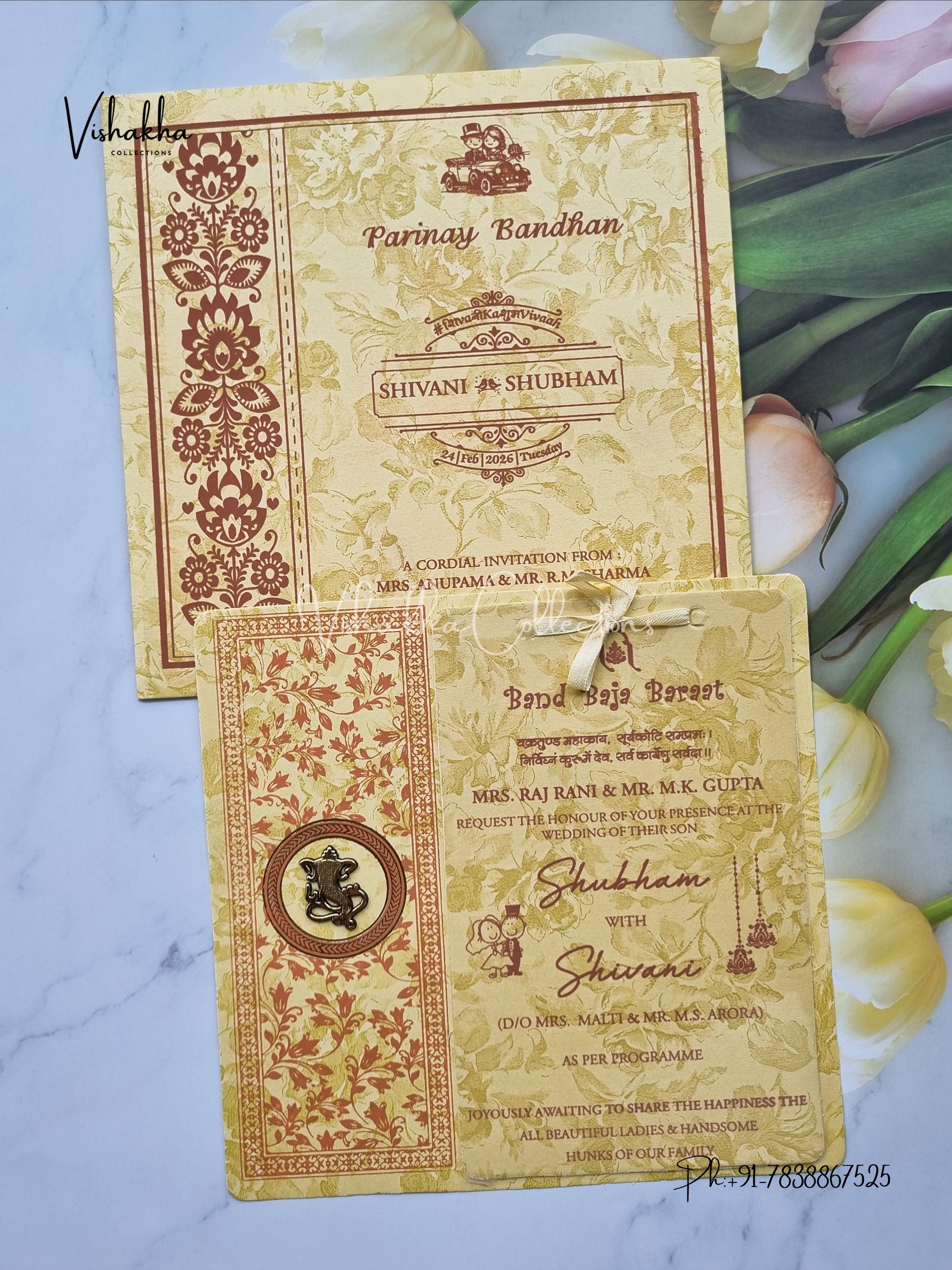 Vishakha Collections presents you beautiful luxury wedding invitation cards with all latest designs and the latest variety. Its just not a wedding invitation card but a beautiful feeling of love and relationship it carries for you. Beautifully printed and packed with a bundle of love. if you like it, dont think again, just go for it.If you are worrying about the quality of the product, send your doubts to us. We are here to help you. If you want in wholesale or bulk, dont forget to contact us.
