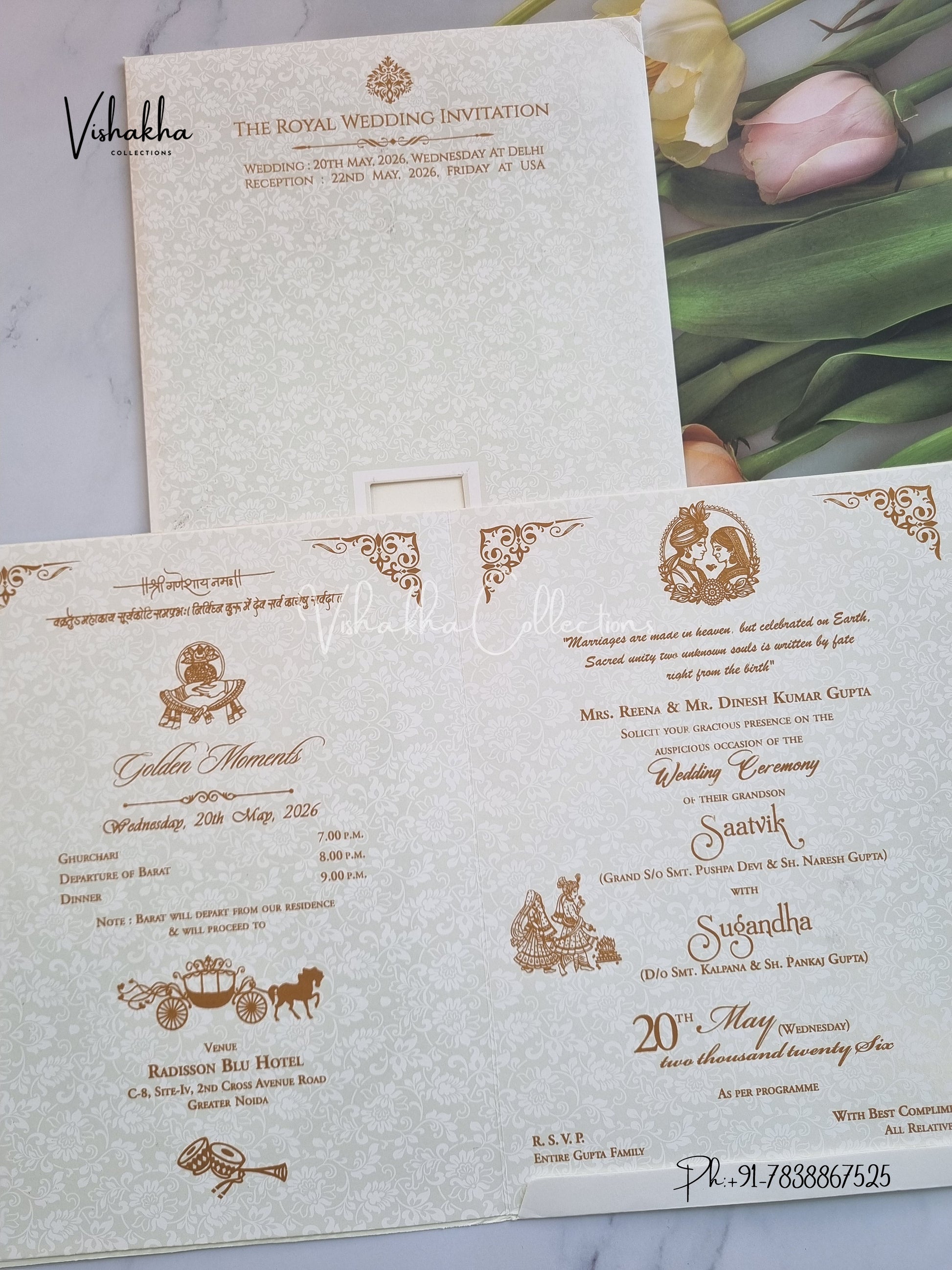 Vishakha Collections presents you beautiful luxury wedding invitation cards with all latest designs and the latest variety. Its just not a wedding invitation card but a beautiful feeling of love and relationship it carries for you. Beautifully printed and packed with a bundle of love. if you like it, dont think again, just go for it.If you are worrying about the quality of the product, send your doubts to us. We are here to help you. If you want in wholesale or bulk, dont forget to contact us.