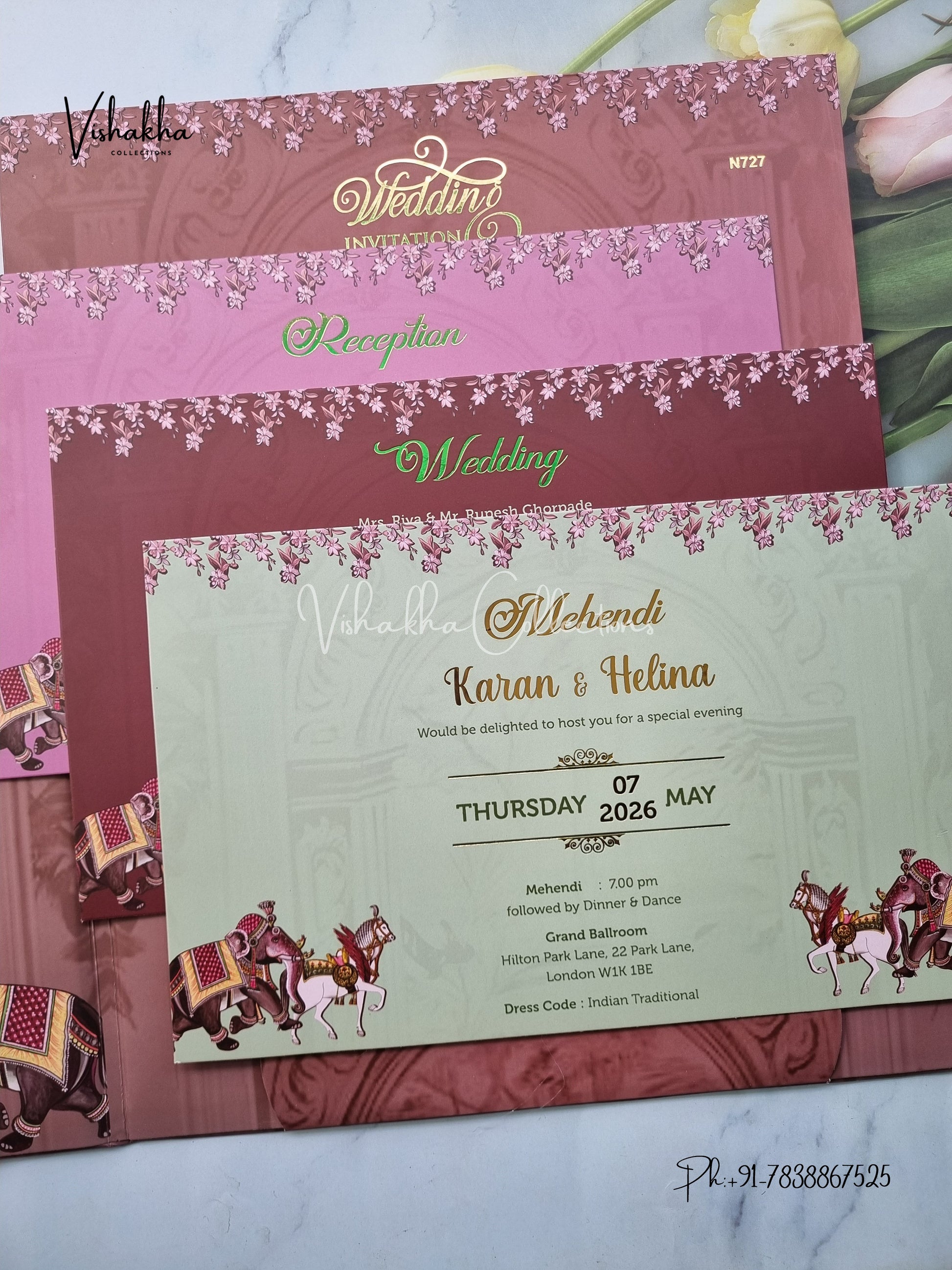 Vishakha Collections presents you beautiful luxury wedding invitation cards with all latest designs and the latest variety. Its just not a wedding invitation card but a beautiful feeling of love and relationship it carries for you. Beautifully printed and packed with a bundle of love. if you like it, dont think again, just go for it.If you are worrying about the quality of the product, send your doubts to us. We are here to help you. If you want in wholesale or bulk, dont forget to contact us.