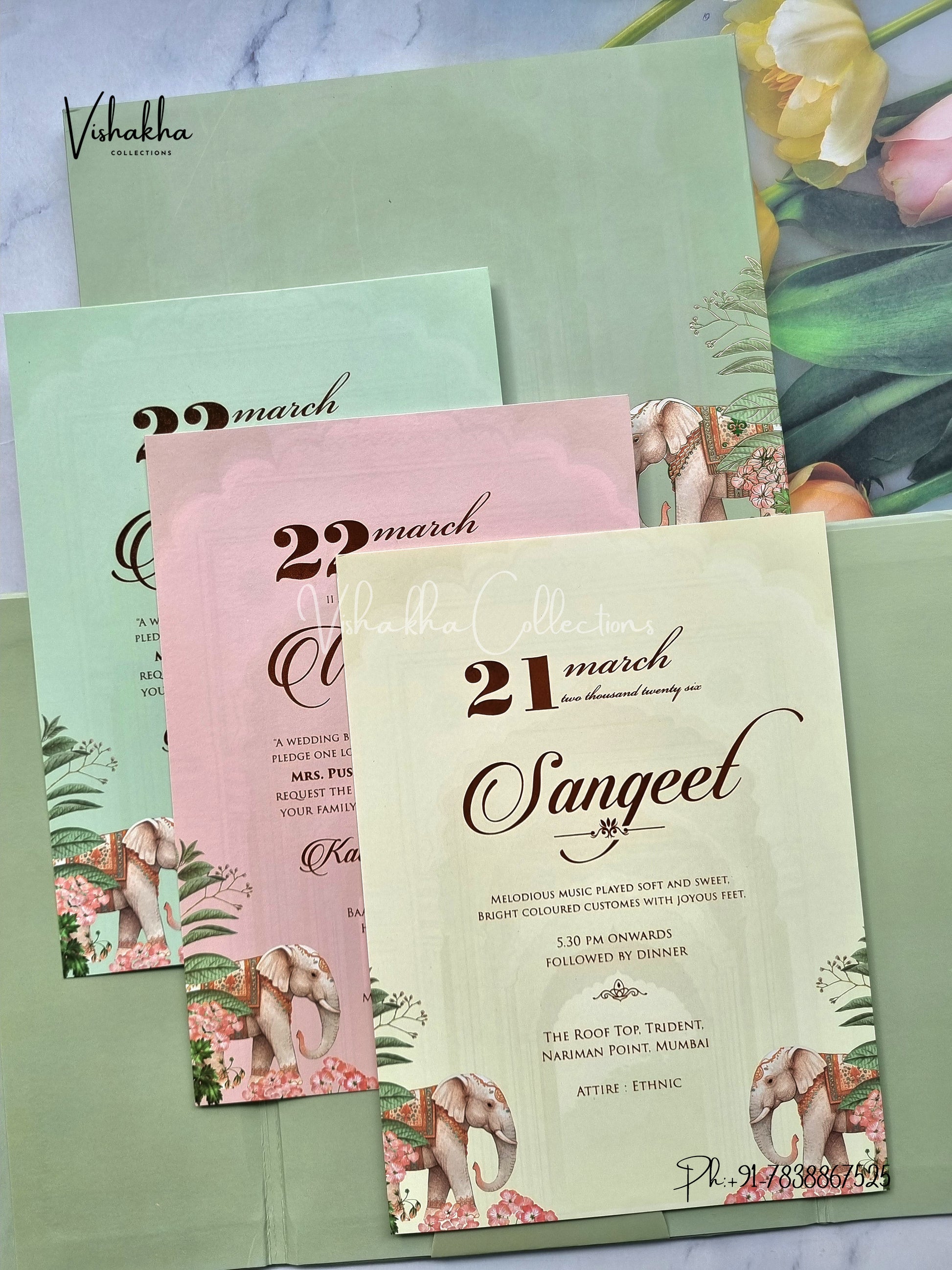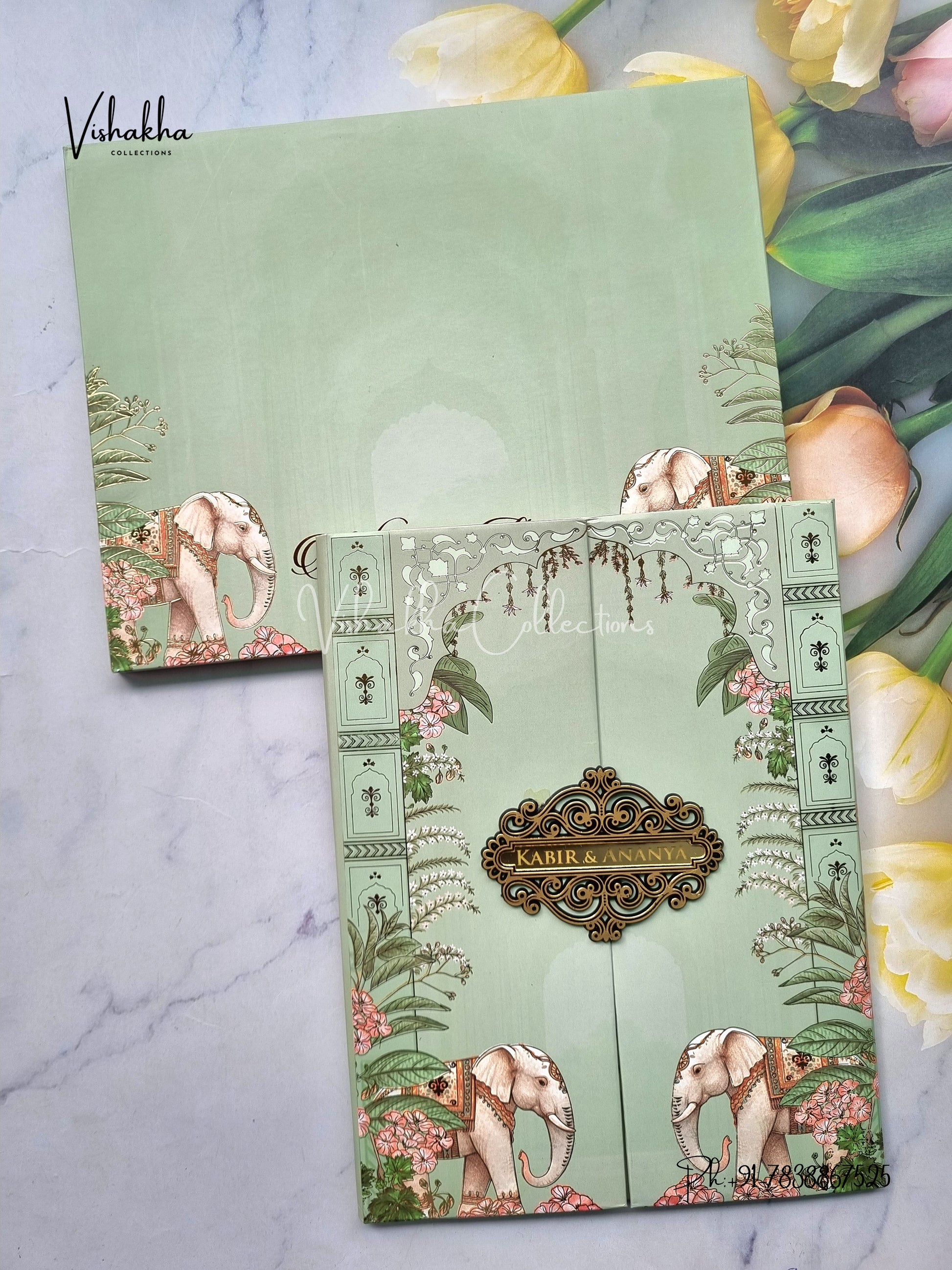 Hathi Hindu Muslim Christian Sikh Padded pista green Colored invitation Cards SK-3486