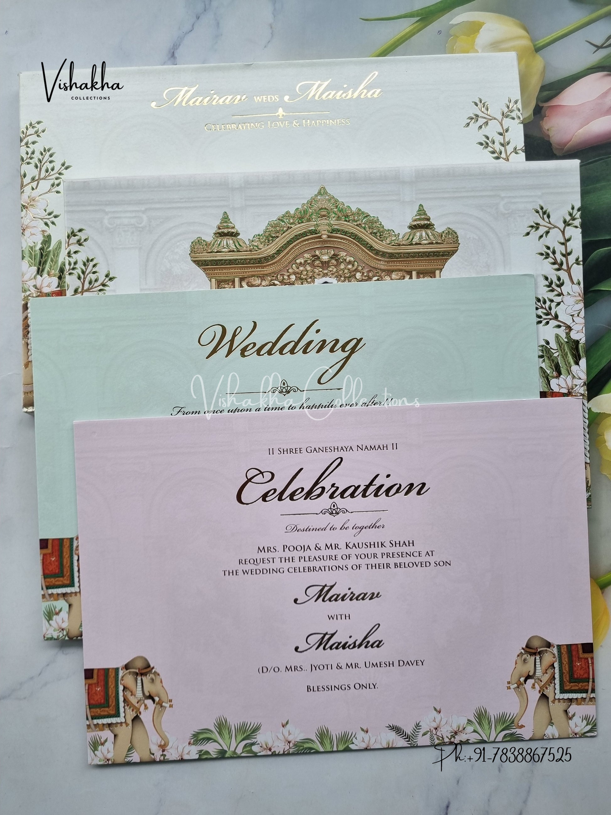 Vishakha Collections presents you beautiful luxury wedding invitation cards with all latest designs and the latest variety. Its just not a wedding invitation card but a beautiful feeling of love and relationship it carries for you. Beautifully printed and packed with a bundle of love. if you like it, dont think again, just go for it.If you are worrying about the quality of the product, send your doubts to us. We are here to help you. If you want in wholesale or bulk, dont forget to contact us.
