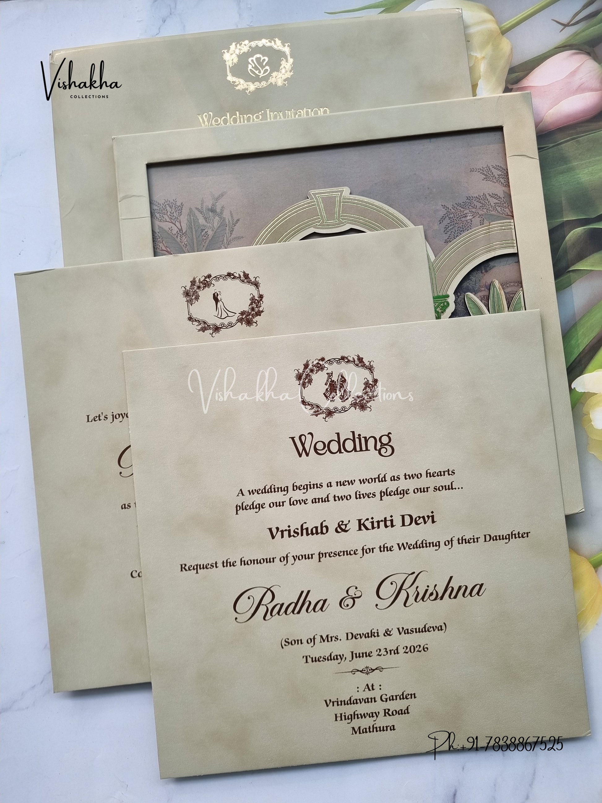 Vishakha Collections presents you beautiful luxury wedding invitation cards with all latest designs and the latest variety. Its just not a wedding invitation card but a beautiful feeling of love and relationship it carries for you. Beautifully printed and packed with a bundle of love. if you like it, dont think again, just go for it.If you are worrying about the quality of the product, send your doubts to us. We are here to help you. If you want in wholesale or bulk, dont forget to contact us.