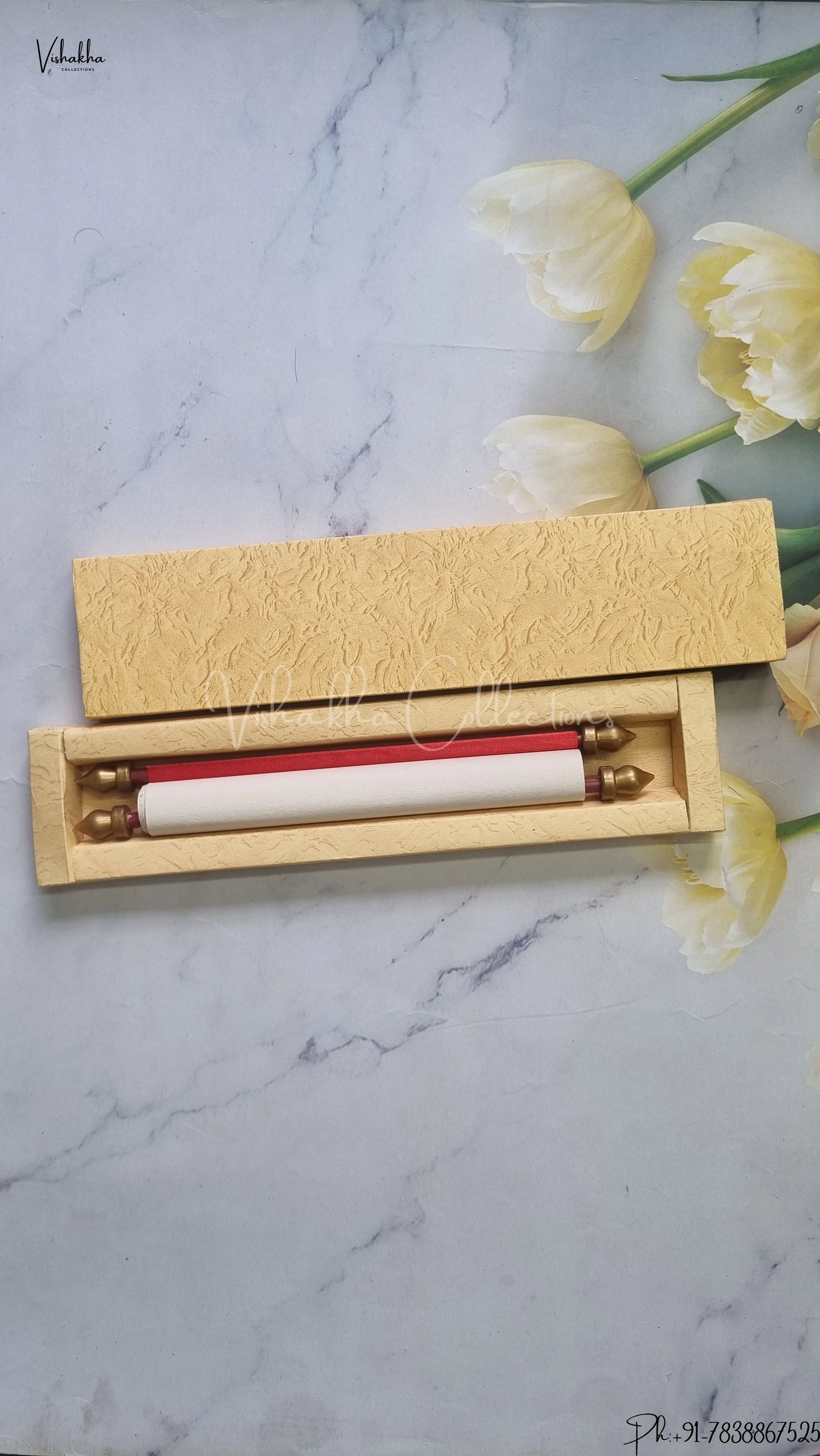 Vishakha Collections presents you beautiful luxury wedding invitation cards with all latest designs and the latest variety. Its just not a wedding invitation card but a beautiful feeling of love and relationship it carries for you. Beautifully printed and packed with a bundle of love. if you like it, dont think again, just go for it.If you are worrying about the quality of the product, send your doubts to us. We are here to help you. If you want in wholesale or bulk, dont forget to contact us.