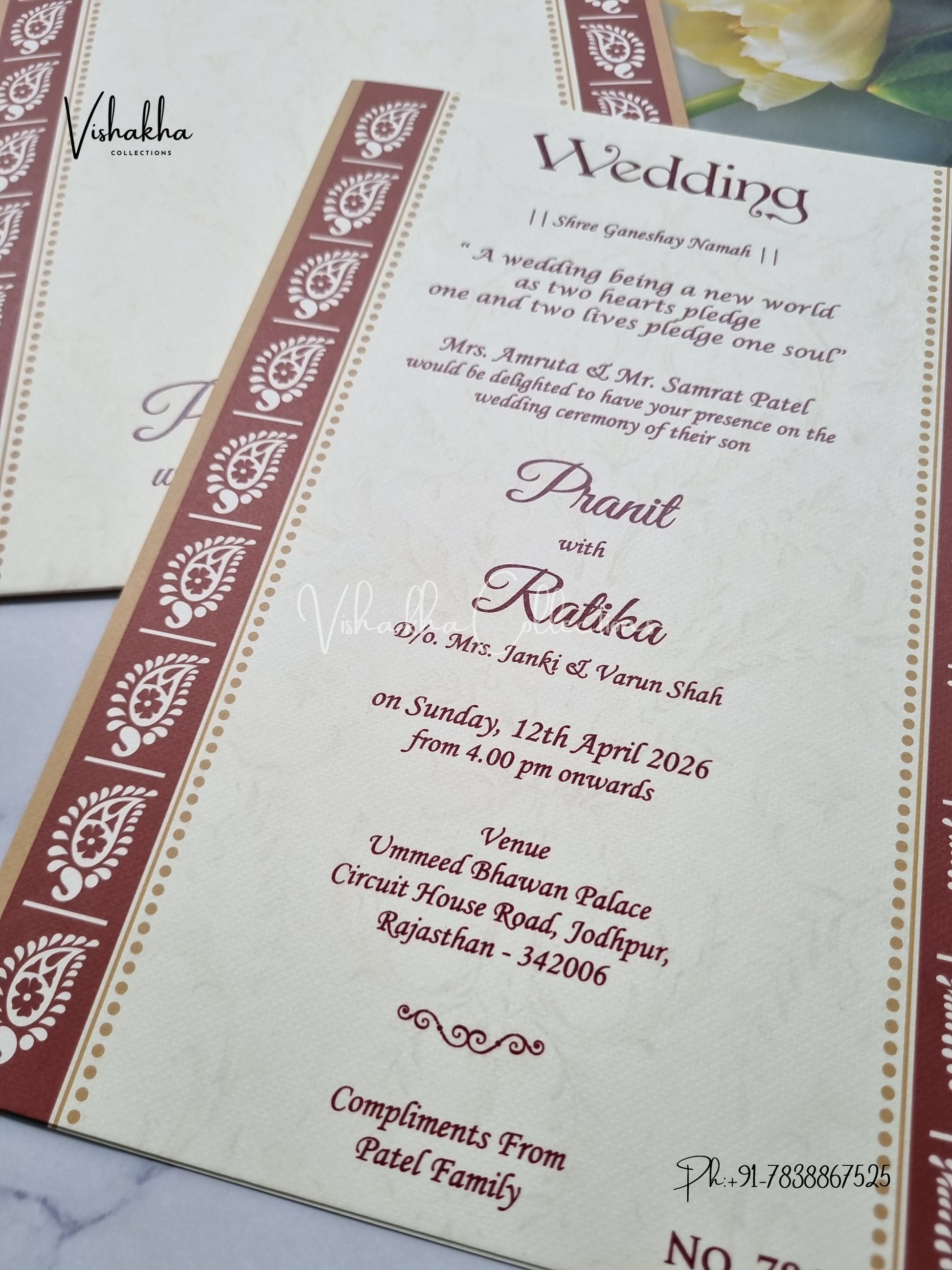 Vishakha Collections presents you beautiful luxury wedding invitation cards with all latest designs and the latest variety. Its just not a wedding invitation card but a beautiful feeling of love and relationship it carries for you. Beautifully printed and packed with a bundle of love. if you like it, dont think again, just go for it.If you are worrying about the quality of the product, send your doubts to us. We are here to help you. If you want in wholesale or bulk, dont forget to contact us.