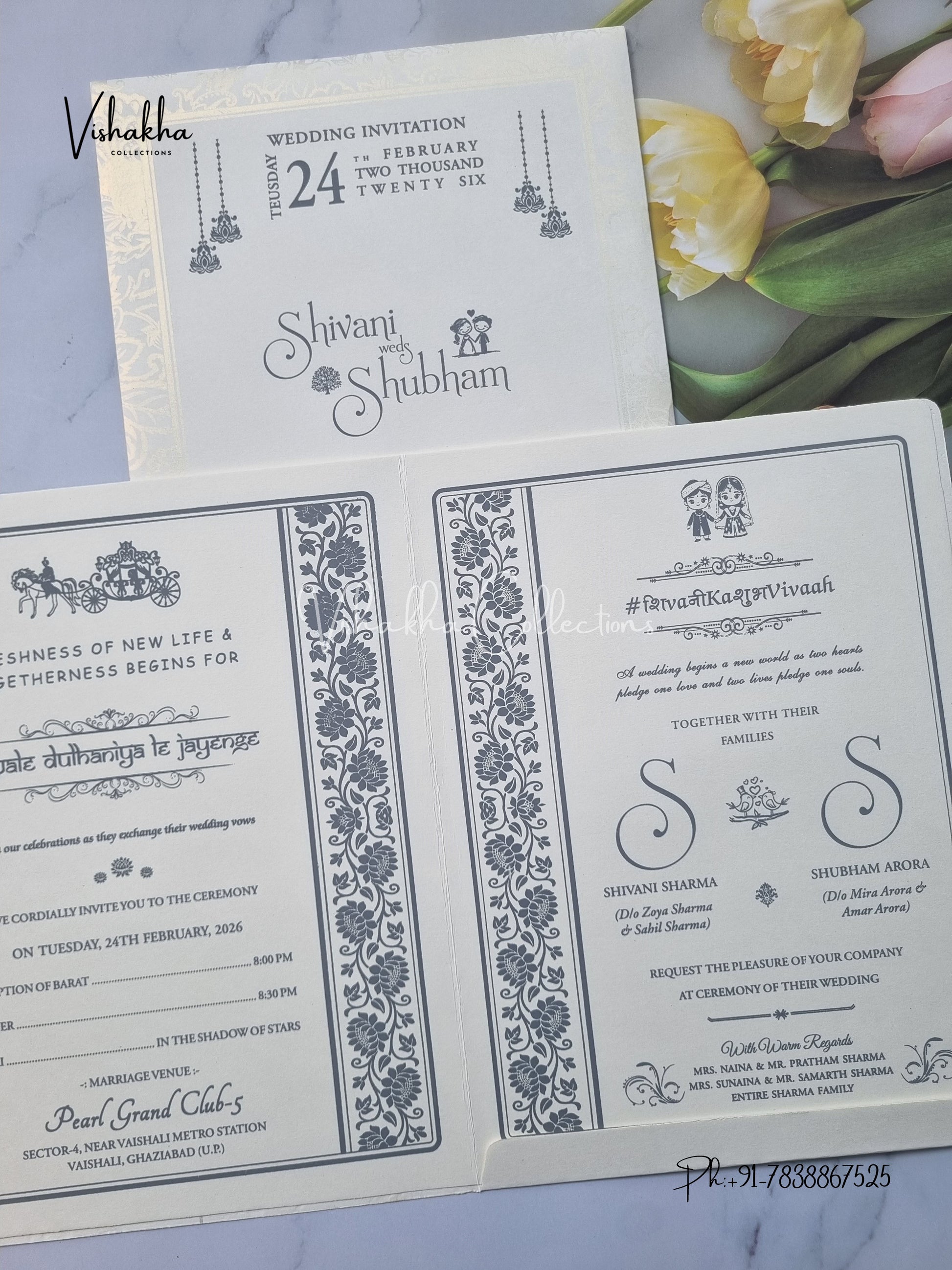 Vishakha Collections presents you beautiful luxury wedding invitation cards with all latest designs and the latest variety. Its just not a wedding invitation card but a beautiful feeling of love and relationship it carries for you. Beautifully printed and packed with a bundle of love. if you like it, dont think again, just go for it.If you are worrying about the quality of the product, send your doubts to us. We are here to help you. If you want in wholesale or bulk, dont forget to contact us.