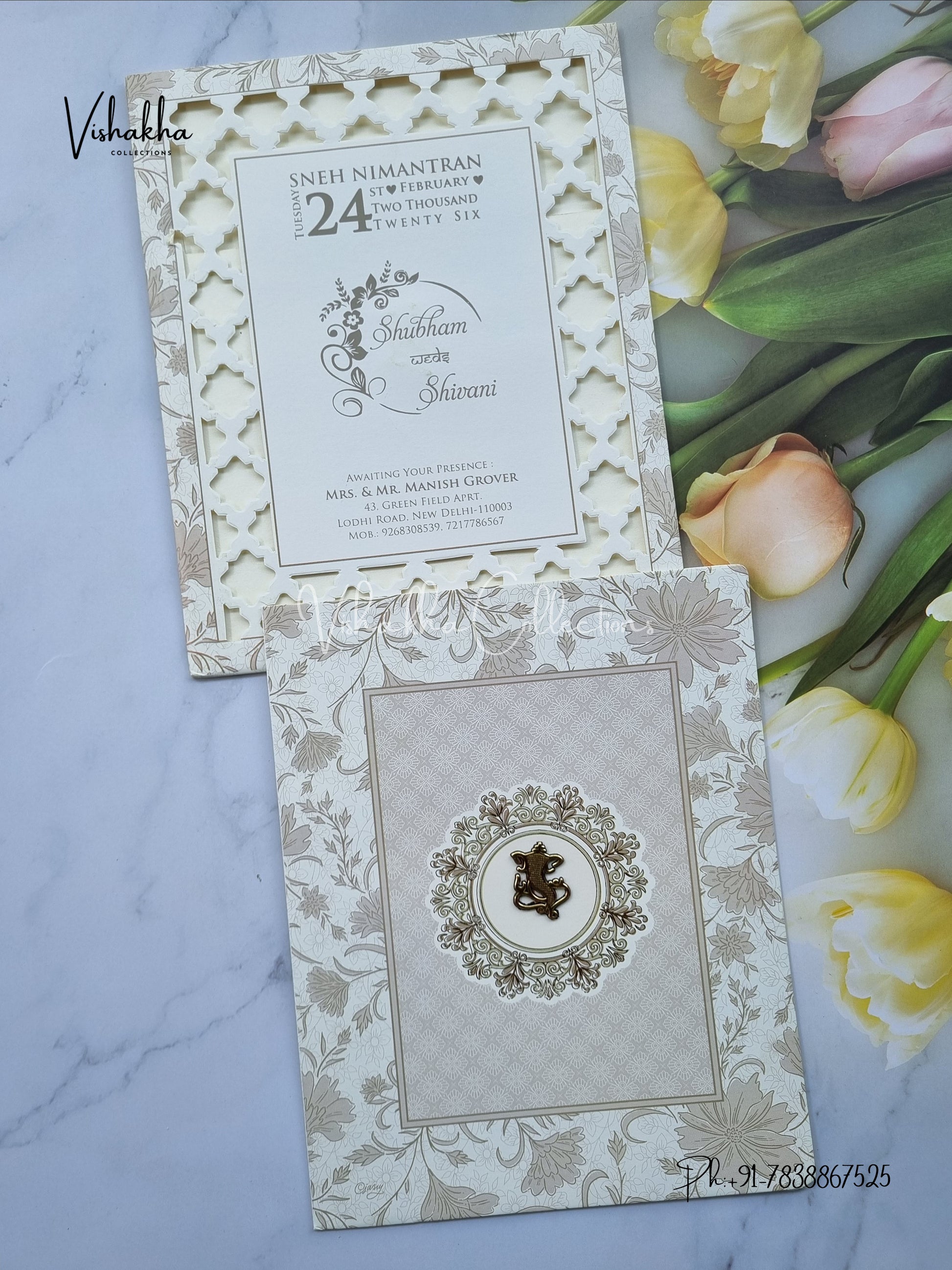 Vishakha Collections presents you beautiful luxury wedding invitation cards with all latest designs and the latest variety. Its just not a wedding invitation card but a beautiful feeling of love and relationship it carries for you. Beautifully printed and packed with a bundle of love. if you like it, dont think again, just go for it.If you are worrying about the quality of the product, send your doubts to us. We are here to help you. If you want in wholesale or bulk, dont forget to contact us.