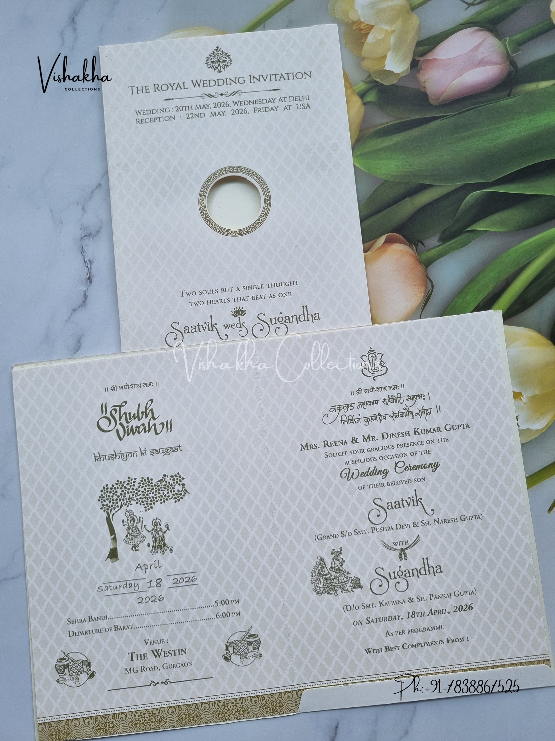 Vishakha Collections presents you beautiful luxury wedding invitation cards with all latest designs and the latest variety. Its just not a wedding invitation card but a beautiful feeling of love and relationship it carries for you. Beautifully printed and packed with a bundle of love. if you like it, dont think again, just go for it.If you are worrying about the quality of the product, send your doubts to us. We are here to help you. If you want in wholesale or bulk, dont forget to contact us.