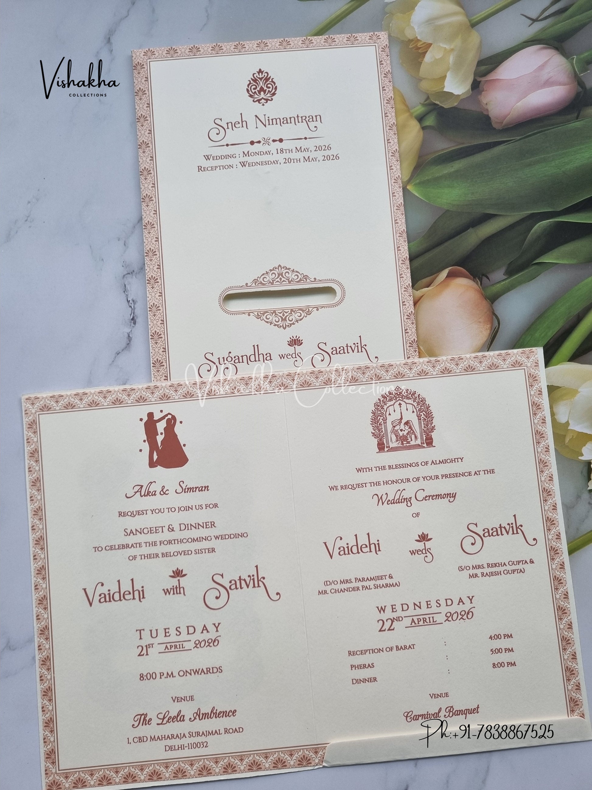 Vishakha Collections presents you beautiful luxury wedding invitation cards with all latest designs and the latest variety. Its just not a wedding invitation card but a beautiful feeling of love and relationship it carries for you. Beautifully printed and packed with a bundle of love. if you like it, dont think again, just go for it.If you are worrying about the quality of the product, send your doubts to us. We are here to help you. If you want in wholesale or bulk, dont forget to contact us.