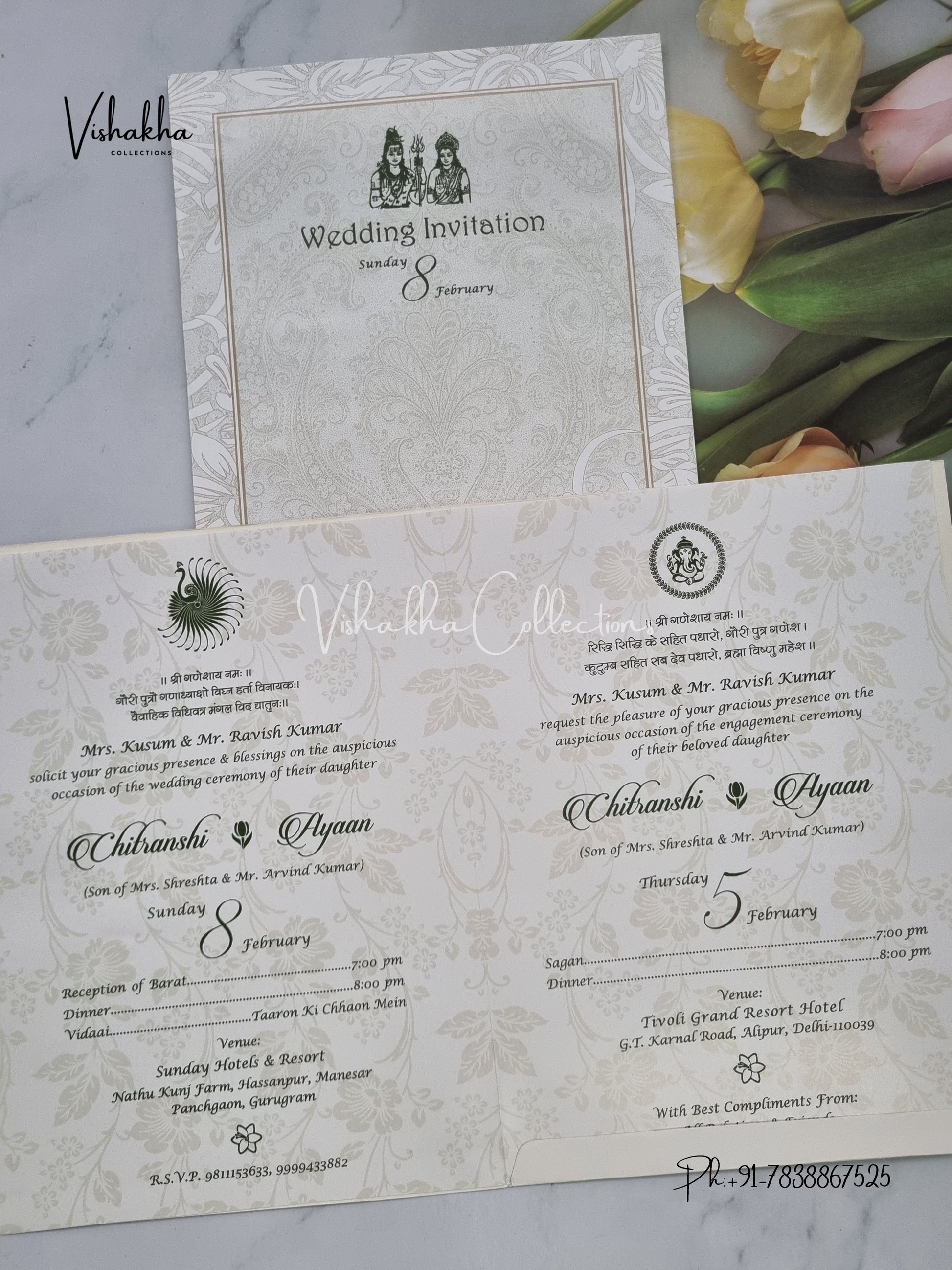 Vishakha Collections presents you beautiful luxury wedding invitation cards with all latest designs and the latest variety. Its just not a wedding invitation card but a beautiful feeling of love and relationship it carries for you. Beautifully printed and packed with a bundle of love. if you like it, dont think again, just go for it.If you are worrying about the quality of the product, send your doubts to us. We are here to help you. If you want in wholesale or bulk, dont forget to contact us.