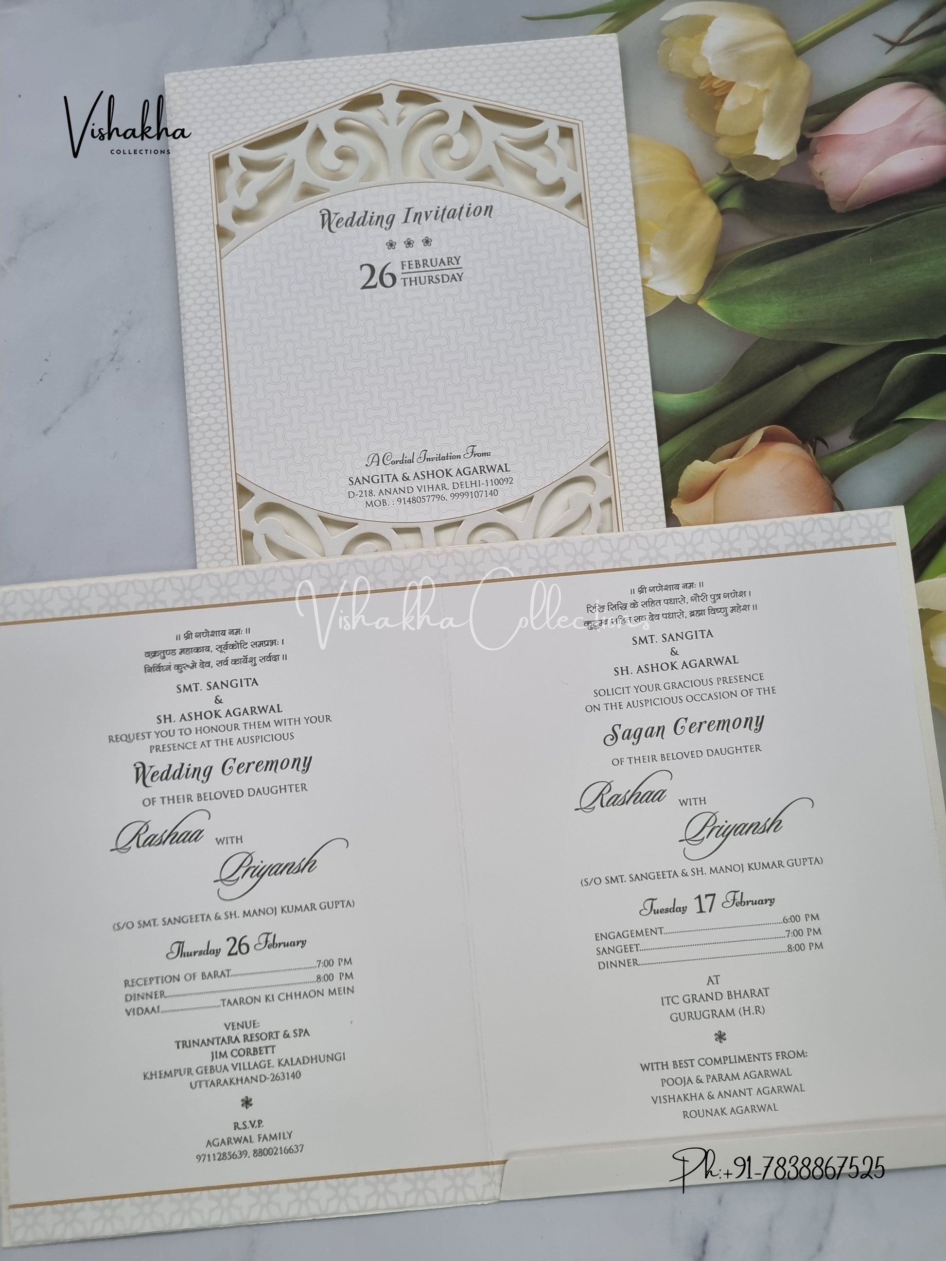 Vishakha Collections presents you beautiful luxury wedding invitation cards with all latest designs and the latest variety. Its just not a wedding invitation card but a beautiful feeling of love and relationship it carries for you. Beautifully printed and packed with a bundle of love. if you like it, dont think again, just go for it.If you are worrying about the quality of the product, send your doubts to us. We are here to help you. If you want in wholesale or bulk, dont forget to contact us.