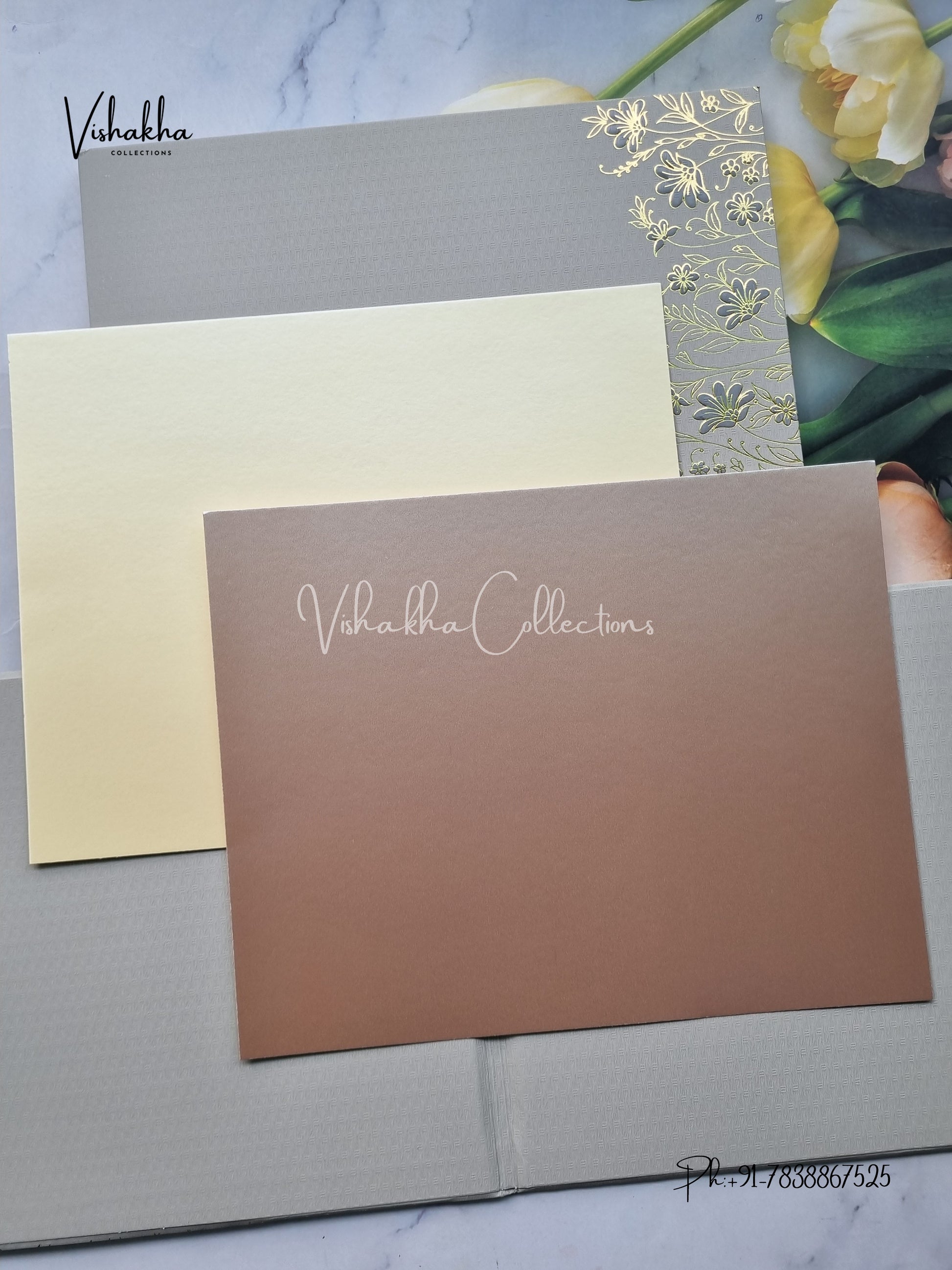 Vishakha Collections presents you beautiful luxury wedding invitation cards with all latest designs and the latest variety. Its just not a wedding invitation card but a beautiful feeling of love and relationship it carries for you. Beautifully printed and packed with a bundle of love. if you like it, dont think again, just go for it.If you are worrying about the quality of the product, send your doubts to us. We are here to help you. If you want in wholesale or bulk, dont forget to contact us.