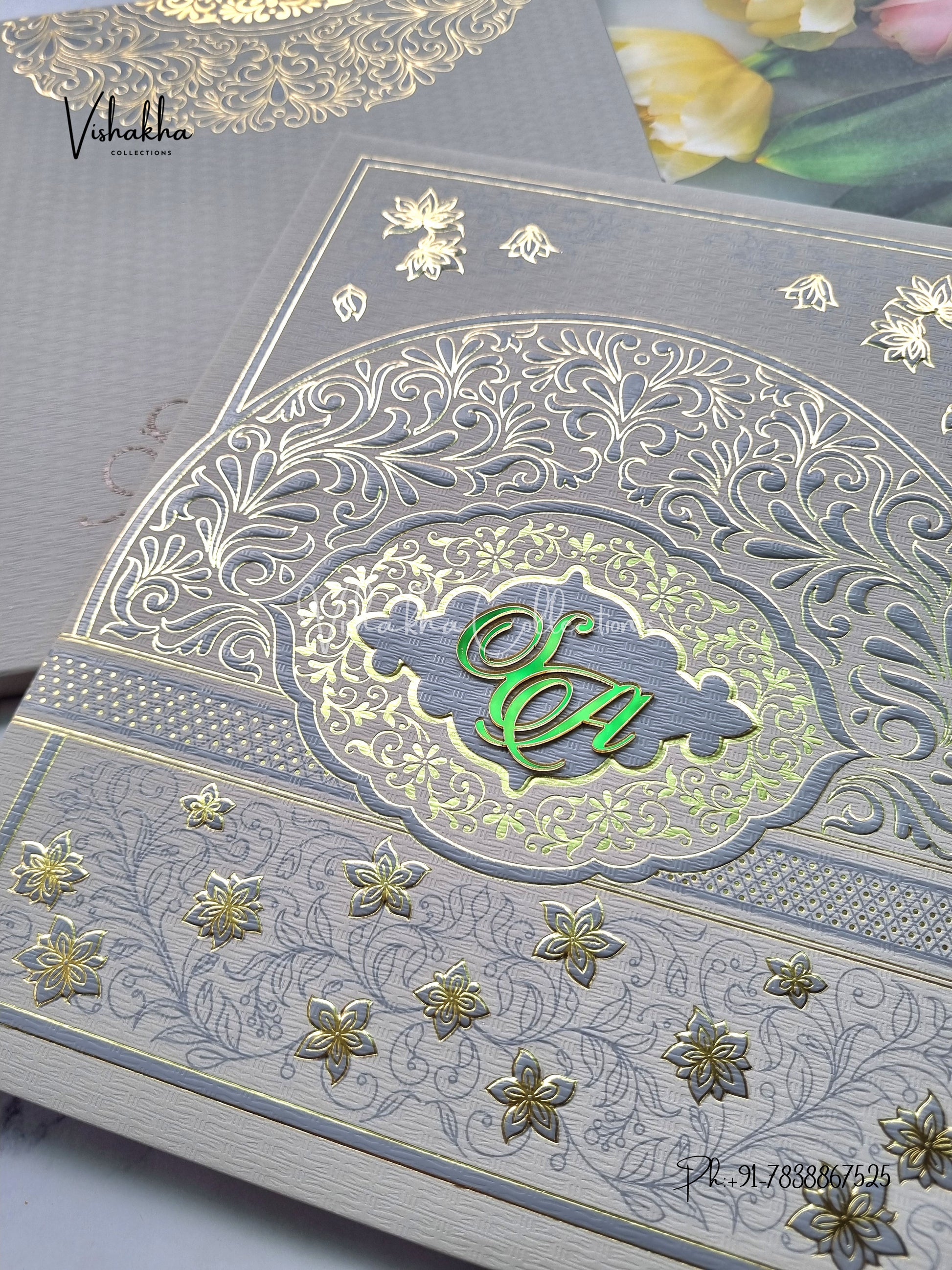 Vishakha Collections presents you beautiful luxury wedding invitation cards with all latest designs and the latest variety. Its just not a wedding invitation card but a beautiful feeling of love and relationship it carries for you. Beautifully printed and packed with a bundle of love. if you like it, dont think again, just go for it.If you are worrying about the quality of the product, send your doubts to us. We are here to help you. If you want in wholesale or bulk, dont forget to contact us.