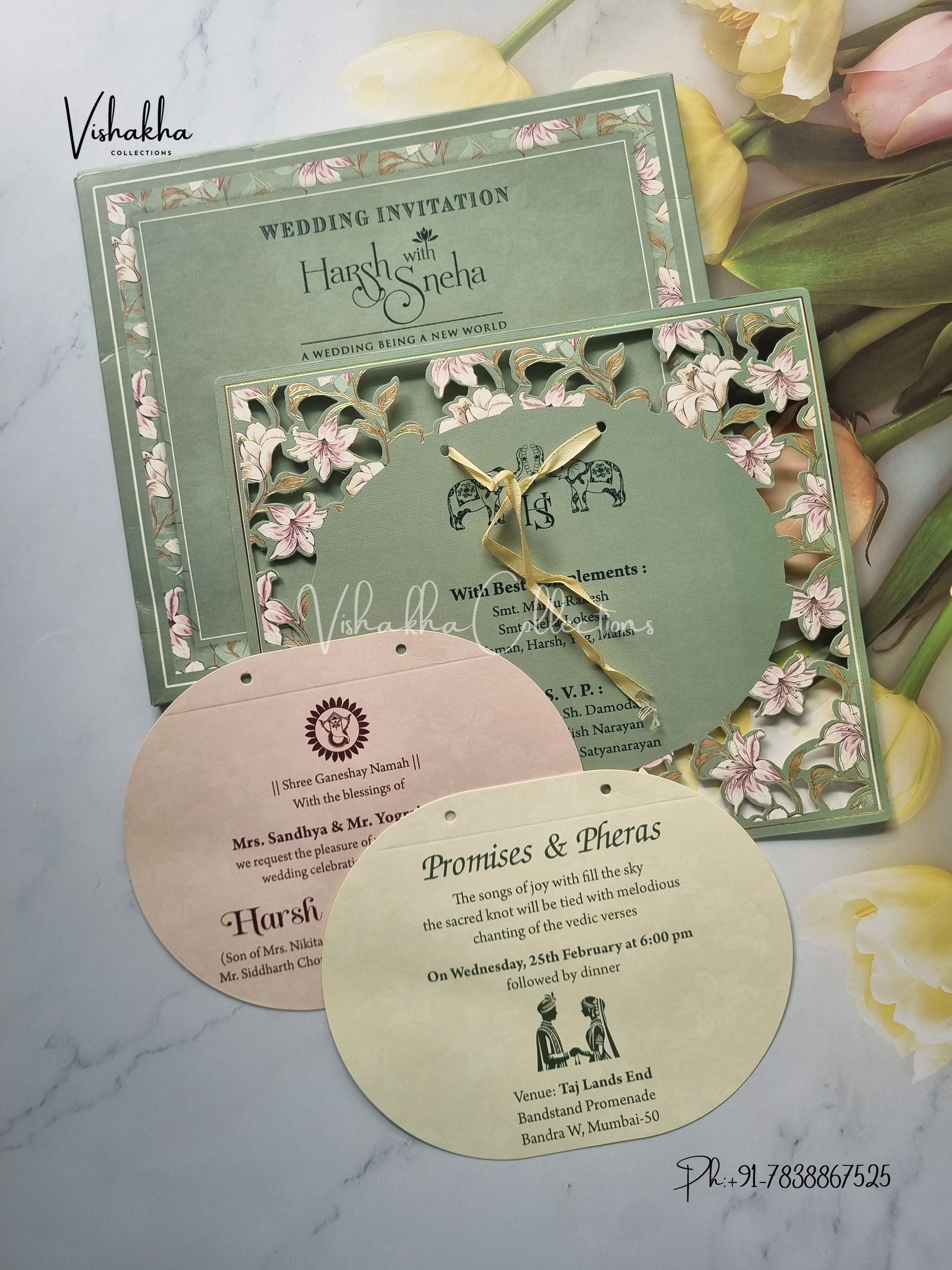 Vishakha Collections presents you beautiful luxury wedding invitation cards with all latest designs and the latest variety. Its just not a wedding invitation card but a beautiful feeling of love and relationship it carries for you. Beautifully printed and packed with a bundle of love. if you like it, dont think again, just go for it.If you are worrying about the quality of the product, send your doubts to us. We are here to help you. If you want in wholesale or bulk, dont forget to contact us.