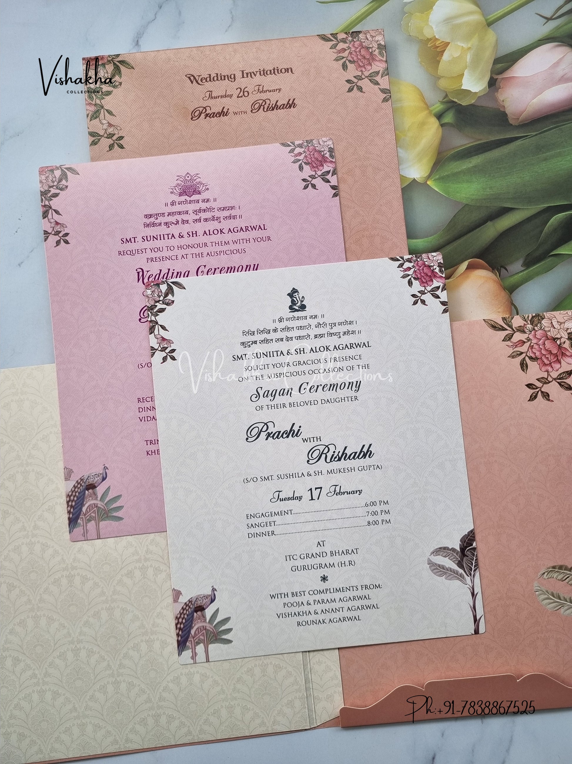 Vishakha Collections presents you beautiful luxury wedding invitation cards with all latest designs and the latest variety. Its just not a wedding invitation card but a beautiful feeling of love and relationship it carries for you. Beautifully printed and packed with a bundle of love. if you like it, dont think again, just go for it.If you are worrying about the quality of the product, send your doubts to us. We are here to help you. If you want in wholesale or bulk, dont forget to contact us.