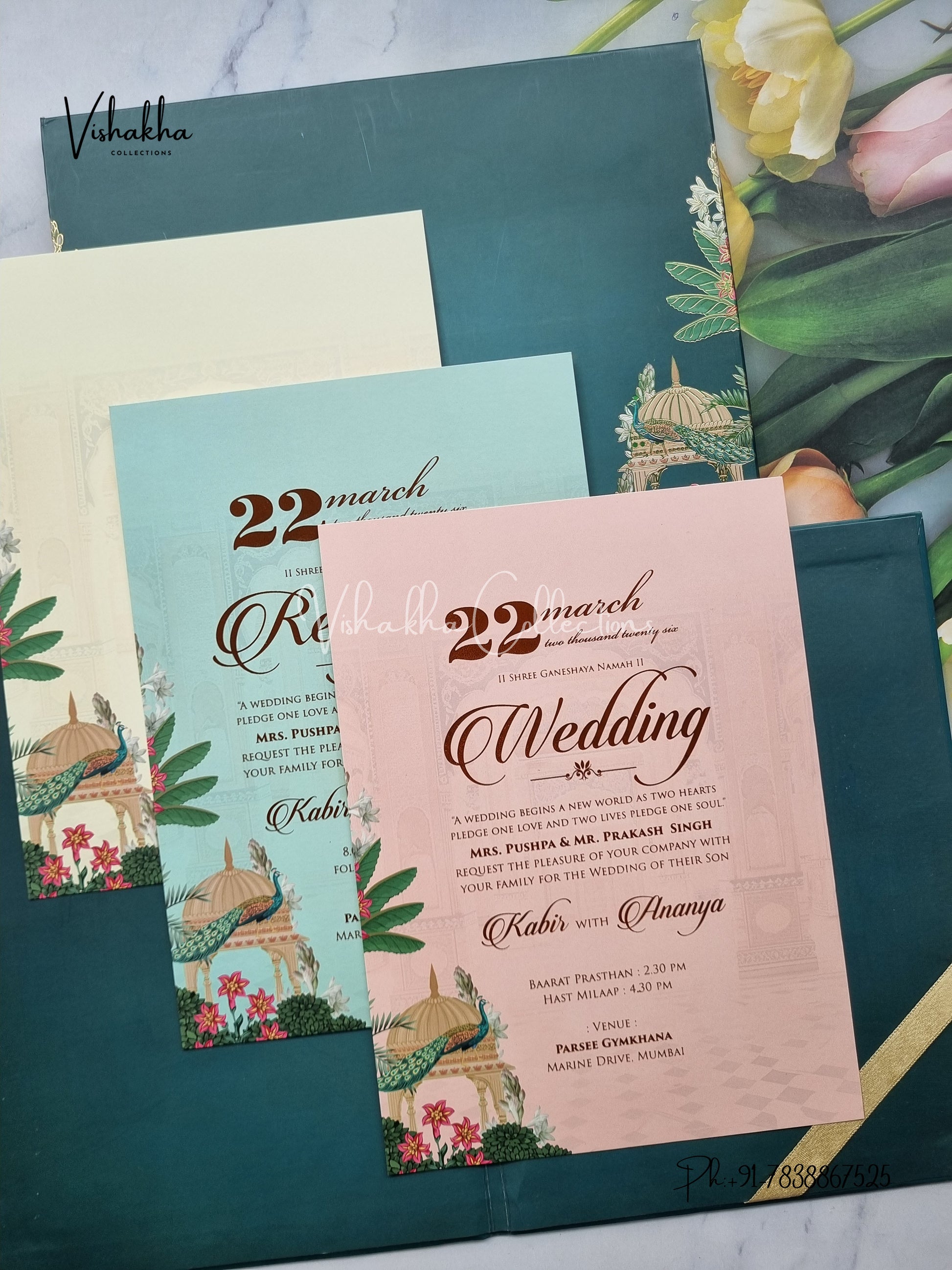 Peacock Hindu Muslim Christian Sikh Padded dark green Colored invitation Cards SK-3485