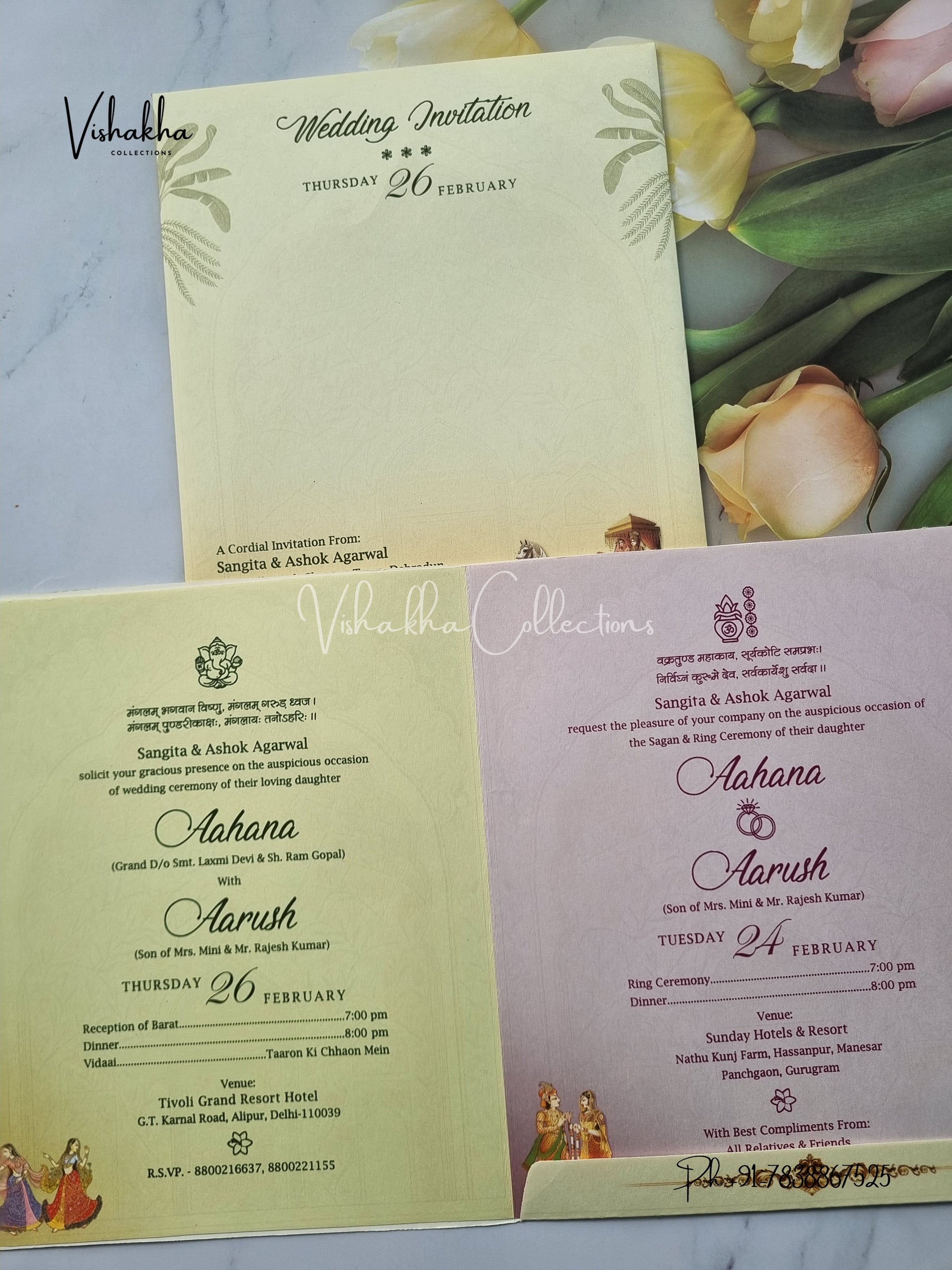 Vishakha Collections presents you beautiful luxury wedding invitation cards with all latest designs and the latest variety. Its just not a wedding invitation card but a beautiful feeling of love and relationship it carries for you. Beautifully printed and packed with a bundle of love. if you like it, dont think again, just go for it.If you are worrying about the quality of the product, send your doubts to us. We are here to help you. If you want in wholesale or bulk, dont forget to contact us.