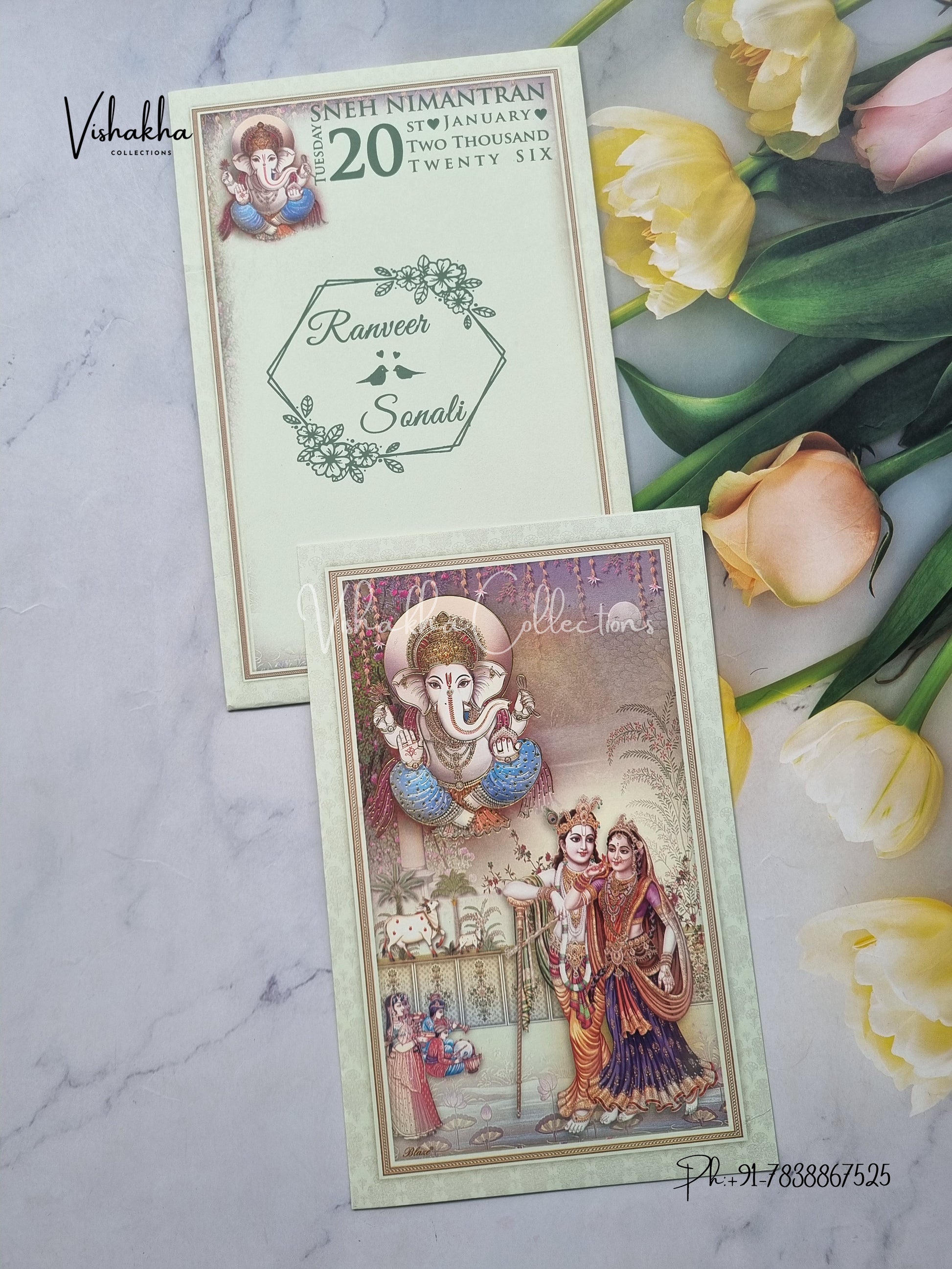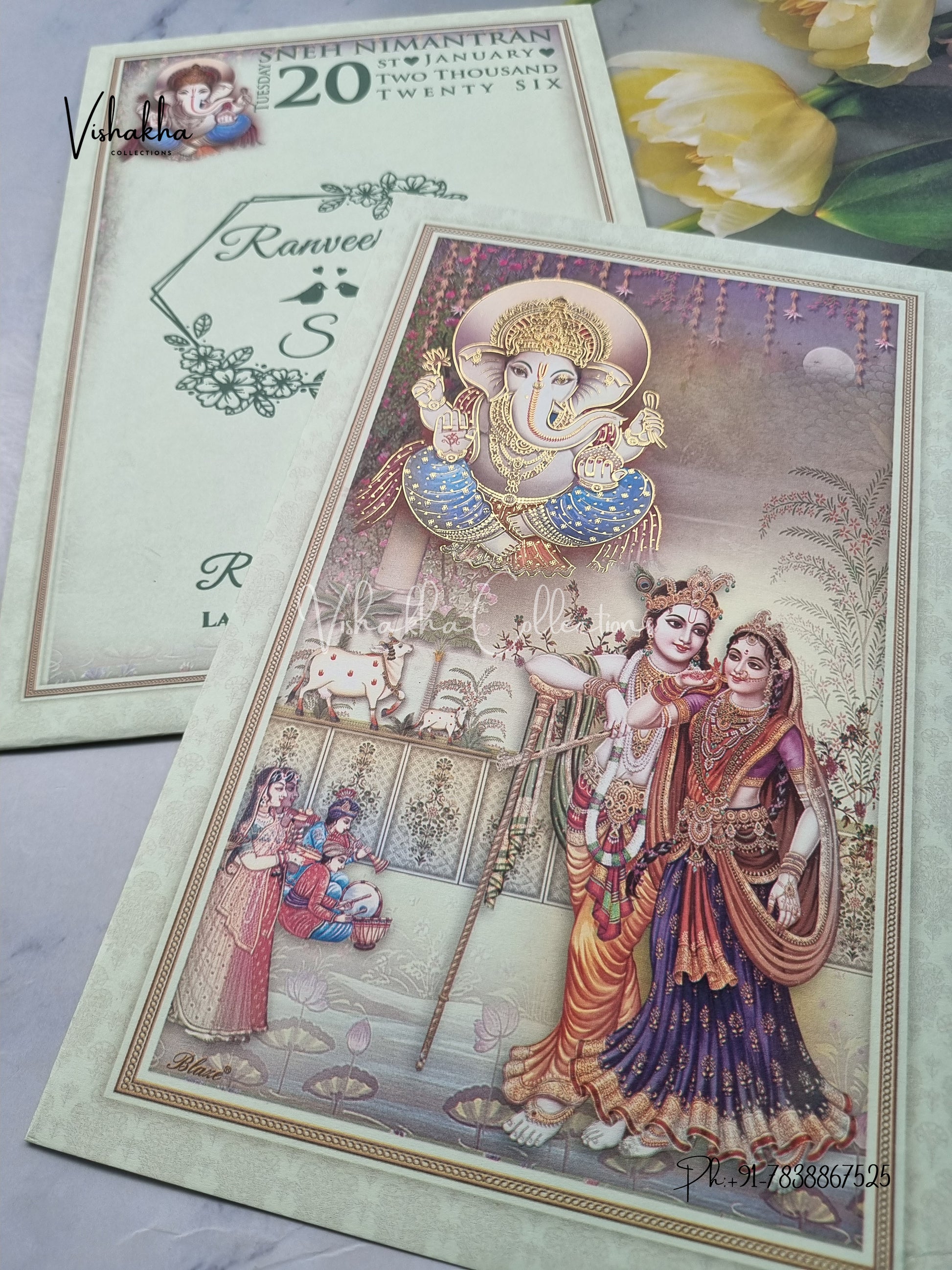 Vishakha Collections presents you beautiful luxury wedding invitation cards with all latest designs and the latest variety. Its just not a wedding invitation card but a beautiful feeling of love and relationship it carries for you. Beautifully printed and packed with a bundle of love. if you like it, dont think again, just go for it.If you are worrying about the quality of the product, send your doubts to us. We are here to help you. If you want in wholesale or bulk, dont forget to contact us.