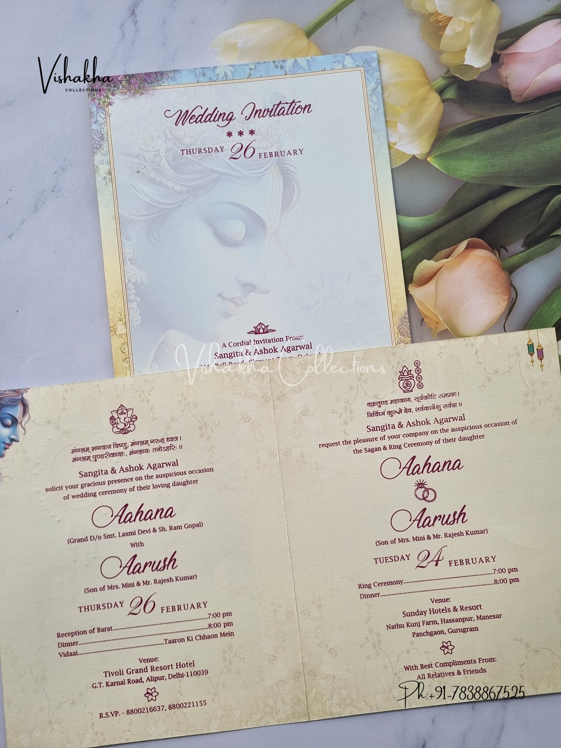 Vishakha Collections presents you beautiful luxury wedding invitation cards with all latest designs and the latest variety. Its just not a wedding invitation card but a beautiful feeling of love and relationship it carries for you. Beautifully printed and packed with a bundle of love. if you like it, dont think again, just go for it.If you are worrying about the quality of the product, send your doubts to us. We are here to help you. If you want in wholesale or bulk, dont forget to contact us.