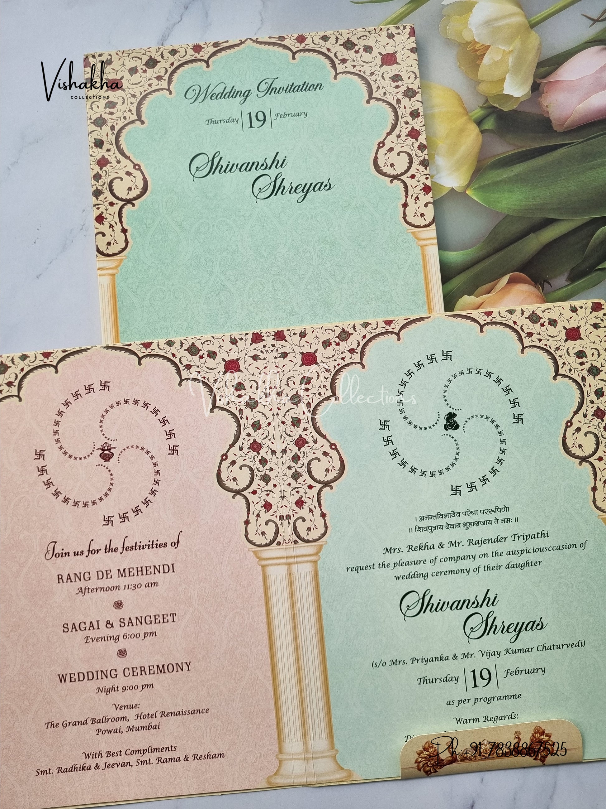 Vishakha Collections presents you beautiful luxury wedding invitation cards with all latest designs and the latest variety. Its just not a wedding invitation card but a beautiful feeling of love and relationship it carries for you. Beautifully printed and packed with a bundle of love. if you like it, dont think again, just go for it.If you are worrying about the quality of the product, send your doubts to us. We are here to help you. If you want in wholesale or bulk, dont forget to contact us.