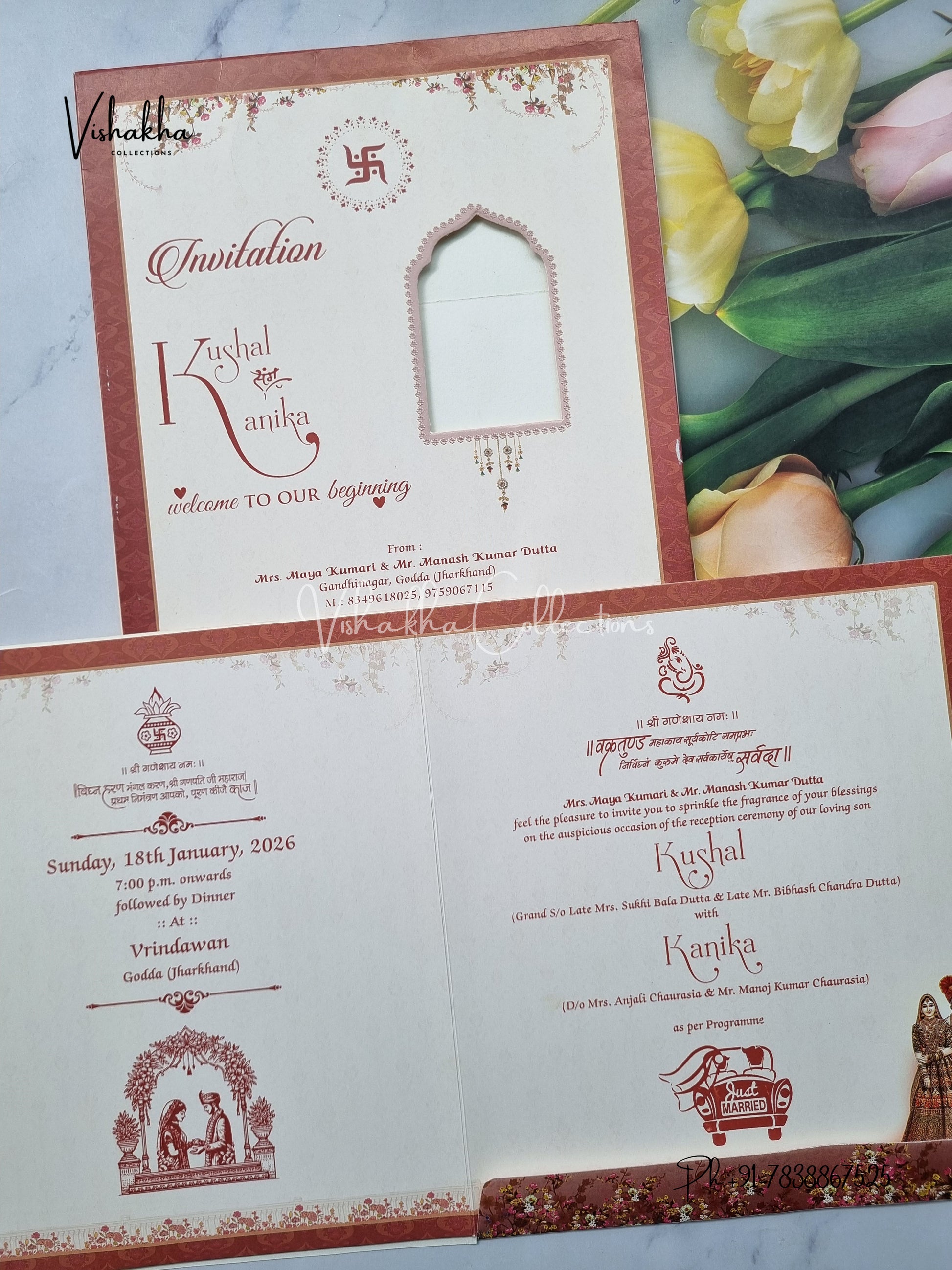 Vishakha Collections presents you beautiful luxury wedding invitation cards with all latest designs and the latest variety. Its just not a wedding invitation card but a beautiful feeling of love and relationship it carries for you. Beautifully printed and packed with a bundle of love. if you like it, dont think again, just go for it.If you are worrying about the quality of the product, send your doubts to us. We are here to help you. If you want in wholesale or bulk, dont forget to contact us.
