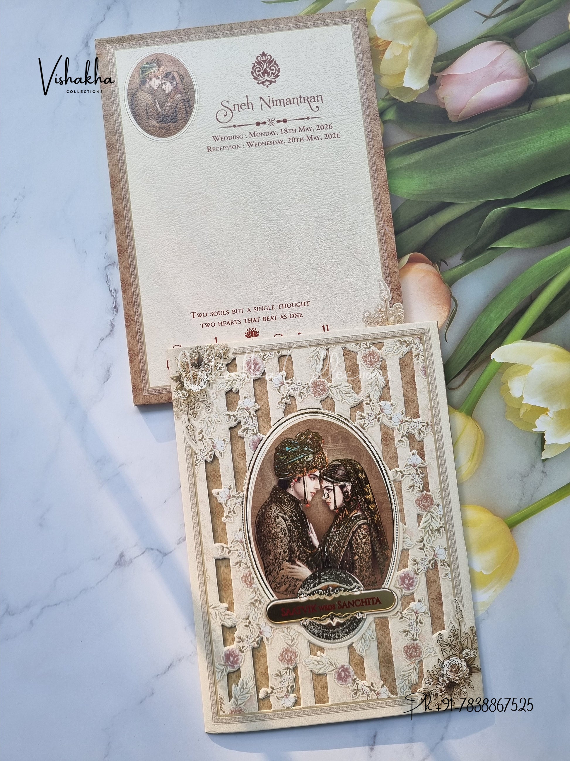 Vishakha Collections presents you beautiful luxury wedding invitation cards with all latest designs and the latest variety. Its just not a wedding invitation card but a beautiful feeling of love and relationship it carries for you. Beautifully printed and packed with a bundle of love. if you like it, dont think again, just go for it.If you are worrying about the quality of the product, send your doubts to us. We are here to help you. If you want in wholesale or bulk, dont forget to contact us.