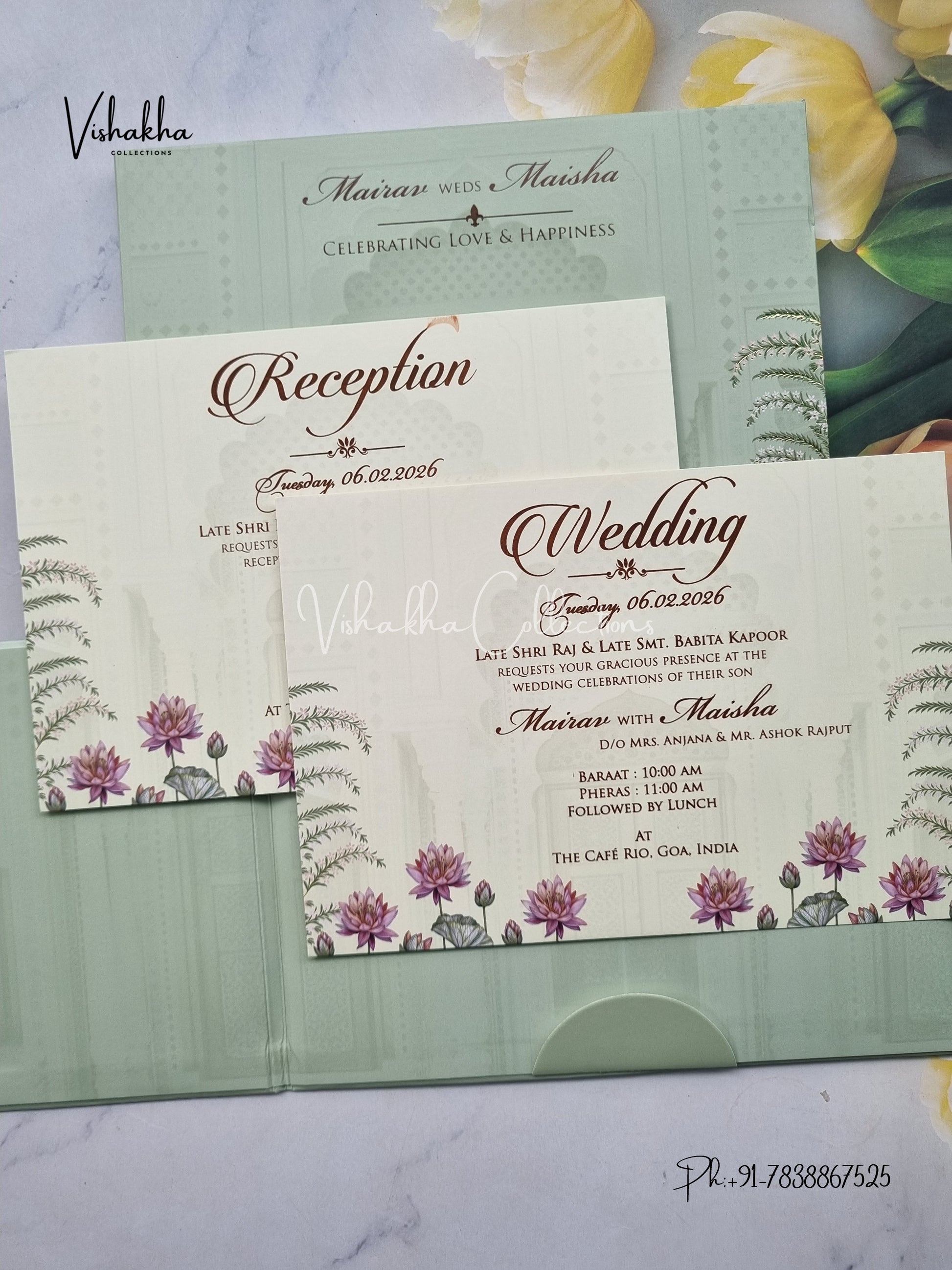 Vishakha Collections presents you beautiful luxury wedding invitation cards with all latest designs and the latest variety. Its just not a wedding invitation card but a beautiful feeling of love and relationship it carries for you. Beautifully printed and packed with a bundle of love. if you like it, dont think again, just go for it.If you are worrying about the quality of the product, send your doubts to us. We are here to help you. If you want in wholesale or bulk, dont forget to contact us.