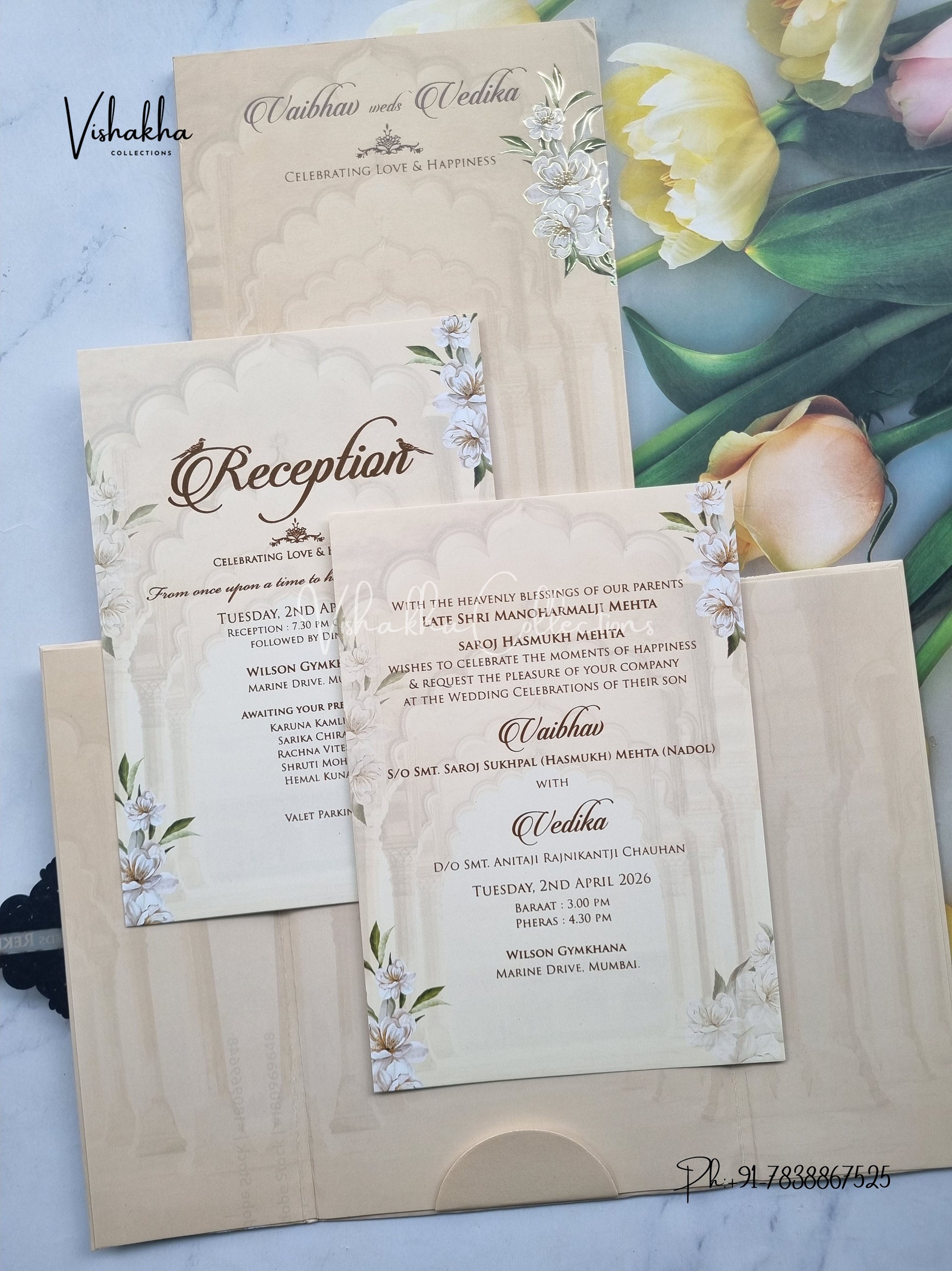 Vishakha Collections presents you beautiful luxury wedding invitation cards with all latest designs and the latest variety. Its just not a wedding invitation card but a beautiful feeling of love and relationship it carries for you. Beautifully printed and packed with a bundle of love. if you like it, dont think again, just go for it.If you are worrying about the quality of the product, send your doubts to us. We are here to help you. If you want in wholesale or bulk, dont forget to contact us.